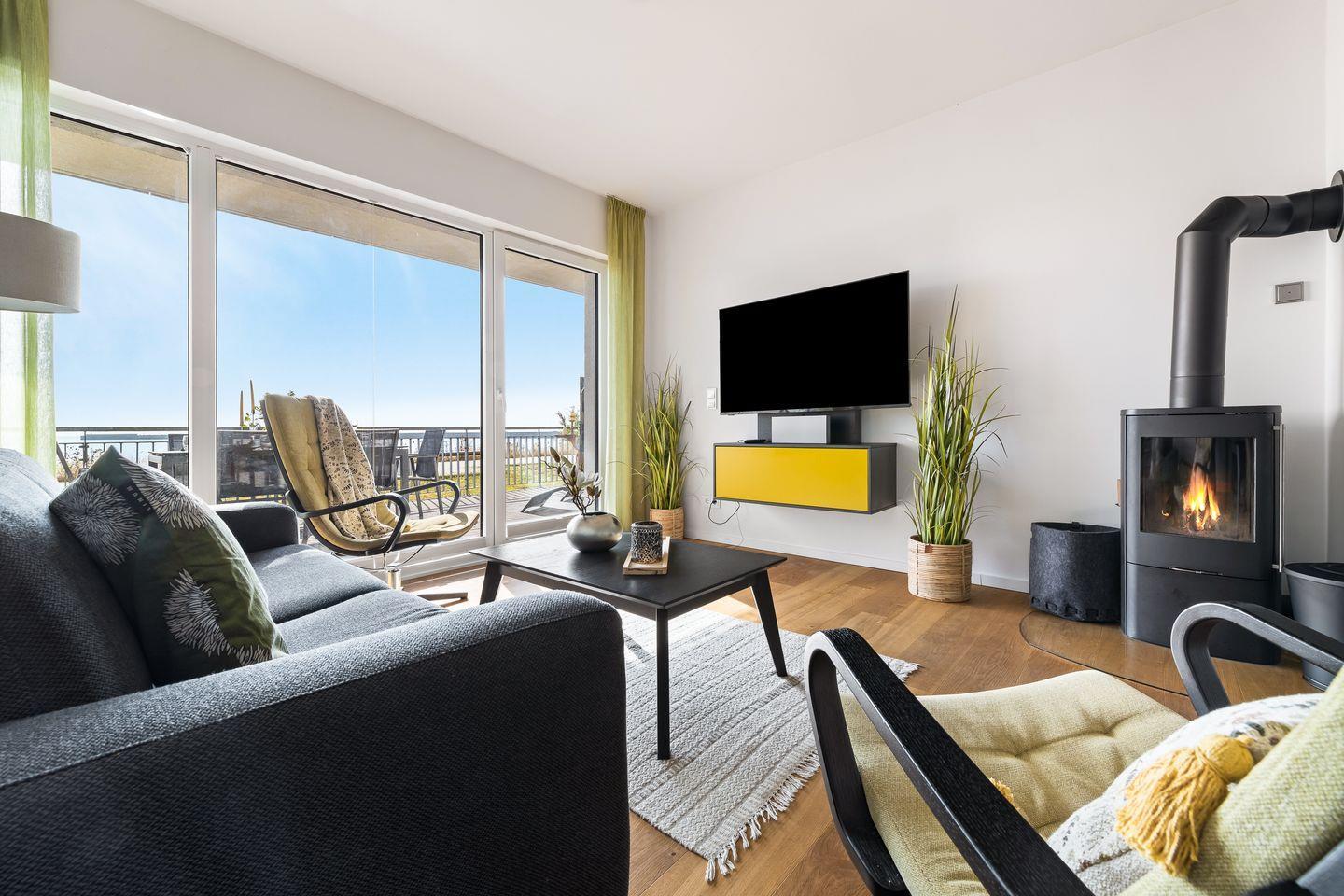 Ein wahrer Wohlfühlort ist der stilvoll möblierte Wohnbereich mit hellem Parkettboden, der durch die Panoramafront einen herrlichen Blick auf die Ostsee bietet. Für Gemütlichkeit sorgt außerdem ein Kaminofen und bequeme Sitzmöbel. Direkt an den Wohnbereich schließt die hochwertige Einbauküche an, sie ist mit allem ausgestattet, was das Hobbykoch-Herz begehrt. Während des Kochens blickt man auf die vorbeiziehenden Segelschiffe - was will man Meer?
