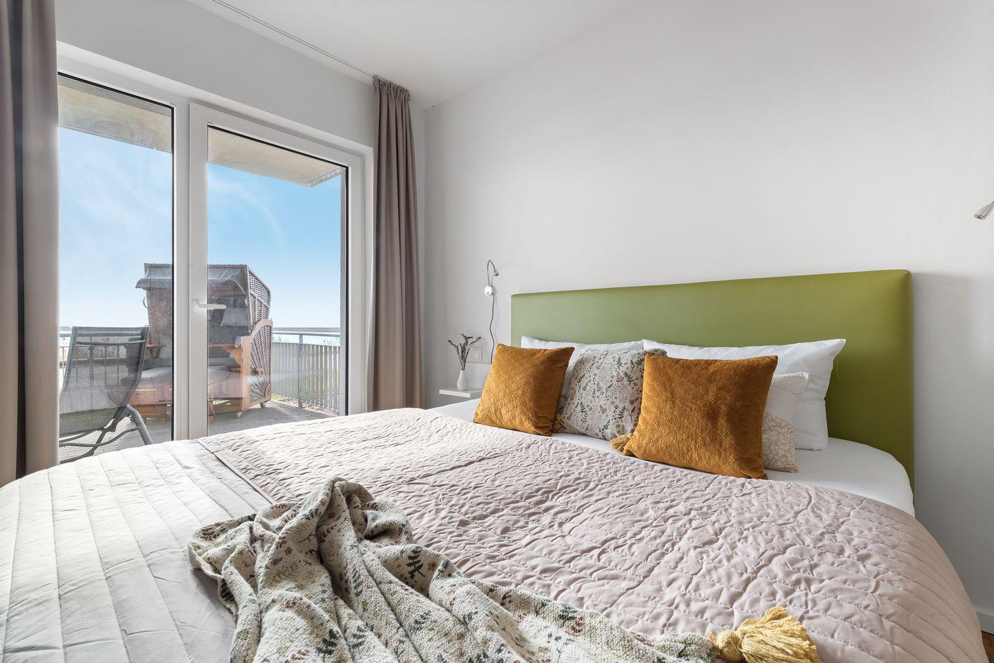 Das Schlafzimmer verfügt über ein hochwertiges Boxspringbett und bodentiefe Fenster. Diese ermöglichen einen traumhaften Blick ins Blaue.
