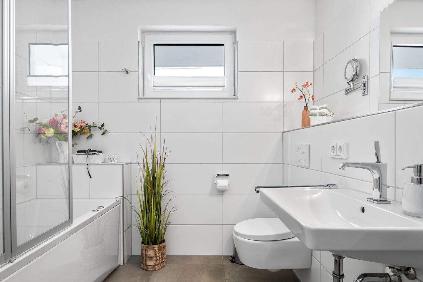 Mit einer Whirlwanne bietet das moderne Badezimmer den idealen Ort, um sich nach einem ereignisreichen Urlaustag zu entspannen.
