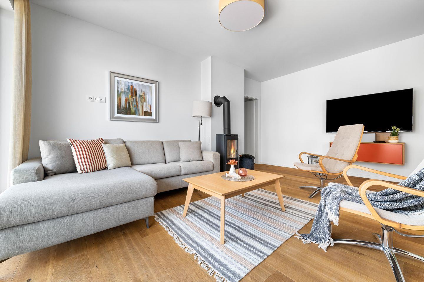 Der Wohnbereich des „Ocean Bird" ist mit hellen Möbeln und hochwertigem Parkettboden ausgestattet und versprüht einem nordisch eleganten Flair. Bequeme Sitzmöbel und ein Kaminofen laden – auch an „Schietwetter Tagen" – zum Entspannen ein. Mit einem Glas Rotwein in der Hand und knisterndem Kaminfeuer im Hintergrund ist die Urlaubsstimmung perfekt.