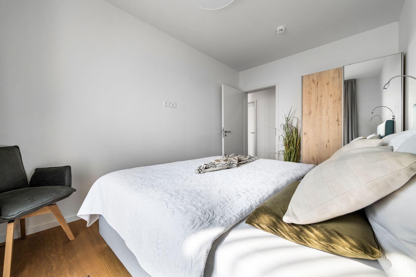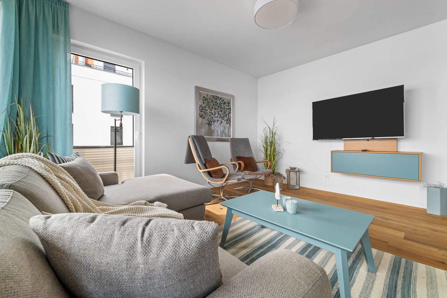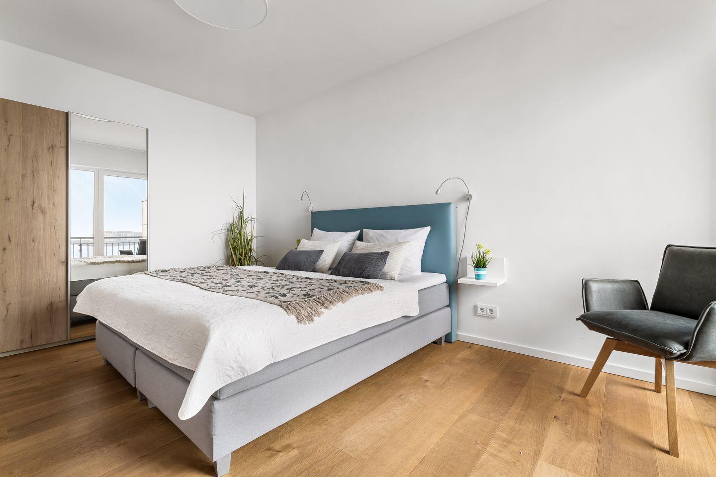 Die drei Schlafzimmer bieten Platz für sechs Personen und verfügen alle über hochwertige Boxspringbetten und bodentiefe Fenster, die sich mit Gardinen abdunkeln lassen. Eins der drei Schlafzimmer hält außerdem einen Flatscreen für Entertainment bereit.