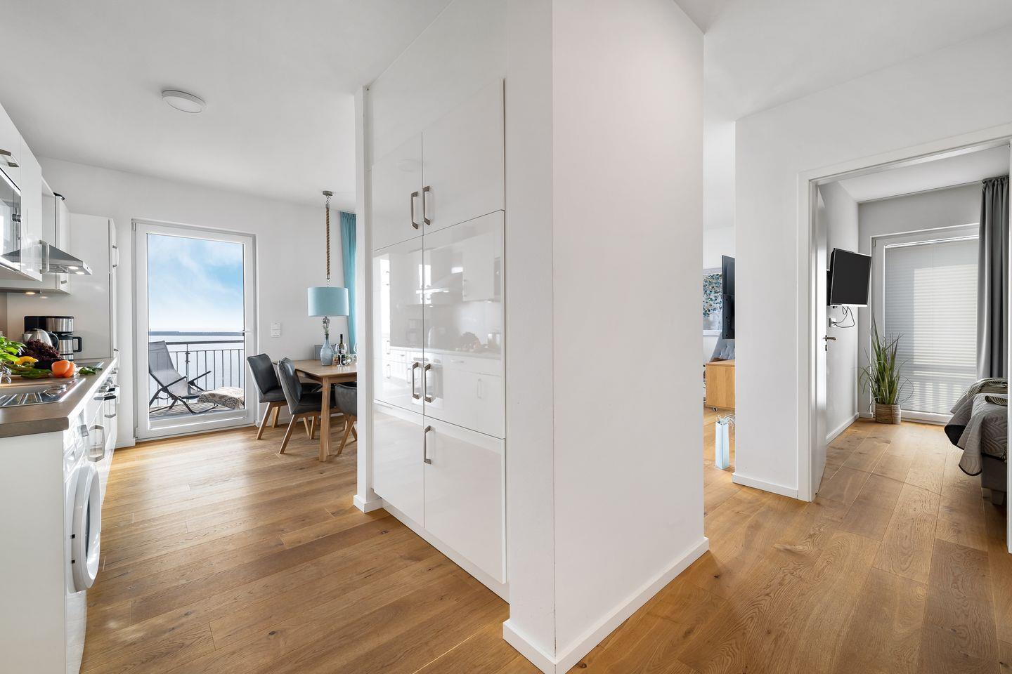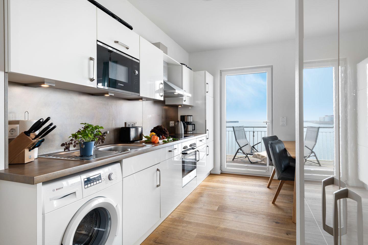 Die offene, moderne Einbauküche bietet alles, was das Hobbykoch-Herz begehrt! Die frisch zubereiteten Köstlichkeiten können im Anschluss mit herrlichem Meerblick am direkt angrenzenden Esstisch oder auf dem großzügigen Balkon verspeist werden. Außerdem bietet der Balkon den perfekten Ort für ein herrliches Sonnenbad. Hier ist Urlaubsstimmung vorprogrammiert!