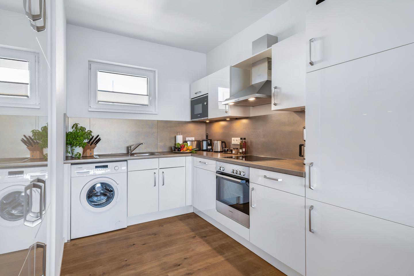 Ein wahrer Wohlfühlort ist der stilvoll möblierte Wohnbereich mit hellem Parkettboden, der durch die Panoramafront einen herrlichen Blick auf die Ostsee bietet. Für Gemütlichkeit sorgt außerdem ein Kaminofen und bequeme Sitzmöbel. Direkt an den Wohnbereich schließt die hochwertige Einbauküche an, sie ist mit allem ausgestattet, was das Hobbykoch-Herz begehrt. Während das Kochens blickt man auf die vorbeiziehenden Segelschiffe - was will man Meer?