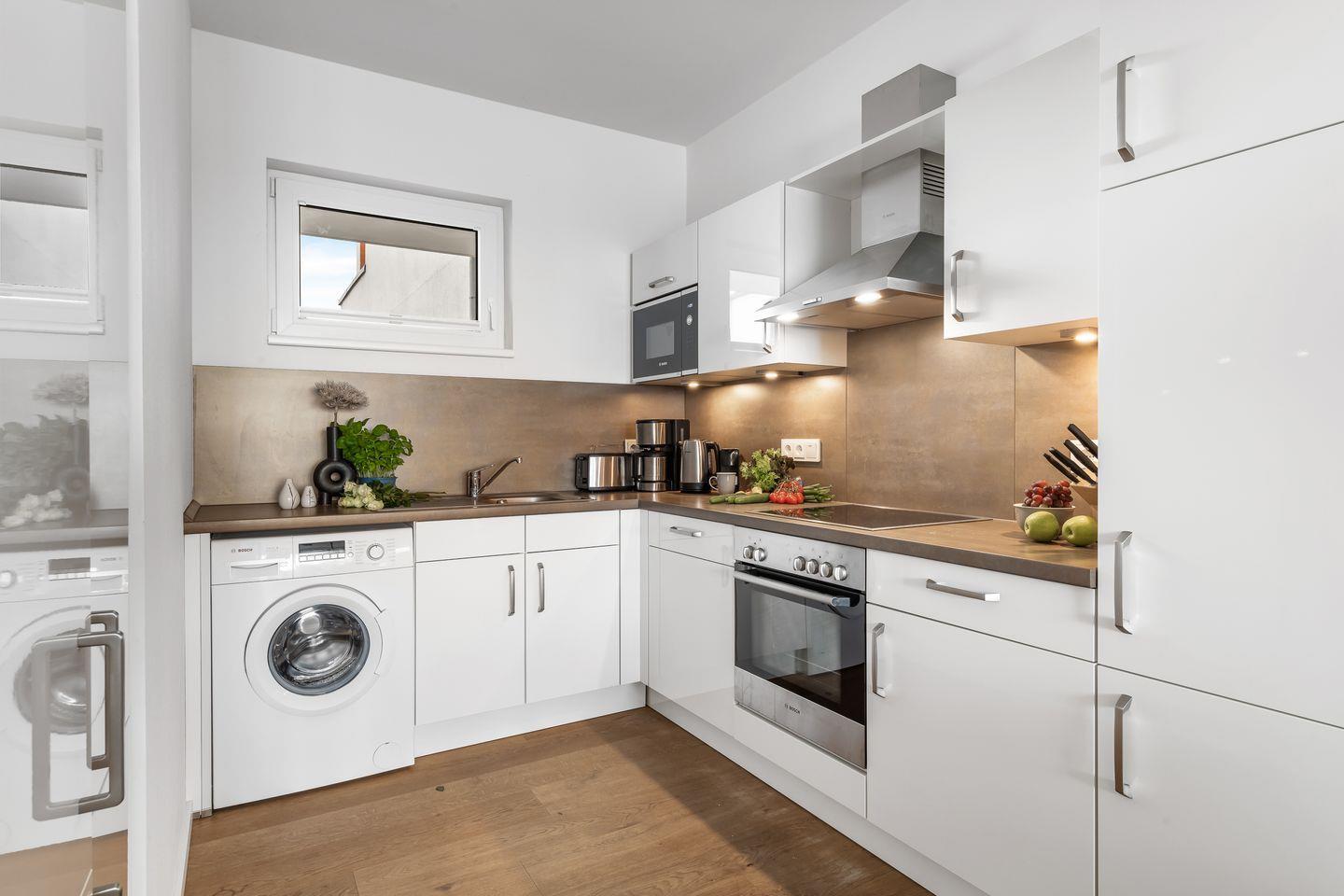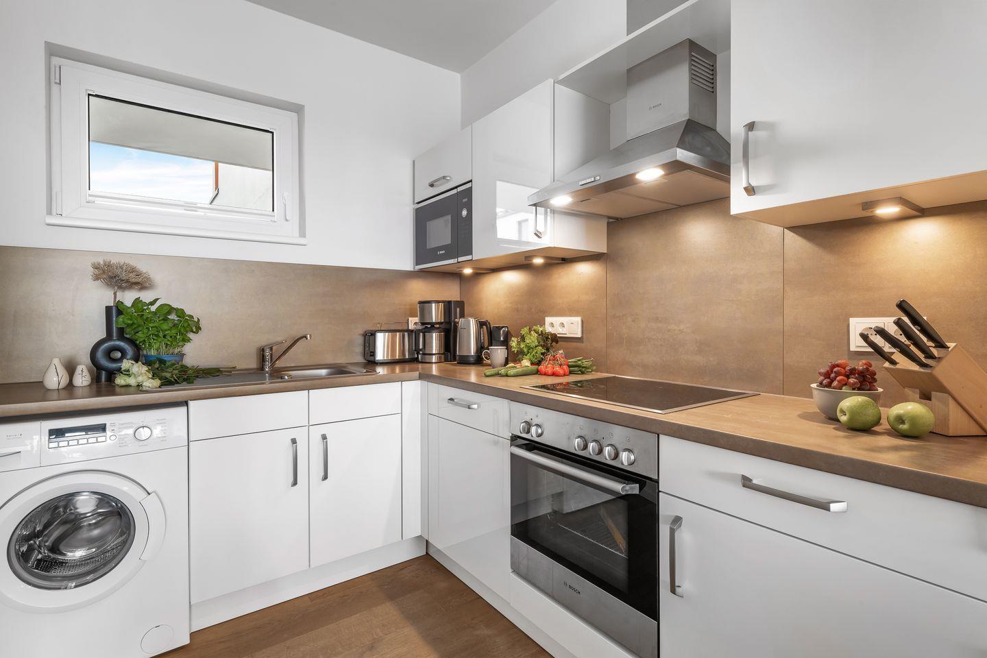 Die voll ausgestattete Küche lädt zu gemütlichen Kochabenden ein sowie gemeinsamen Abendessen mit Meerblick. An Tagen mit „steifer Brise" stehen bequeme Sofas und ein großer Smart-TV bereit um einen gemütlichen Filmabend vor Kaminfeuer zu genießen.