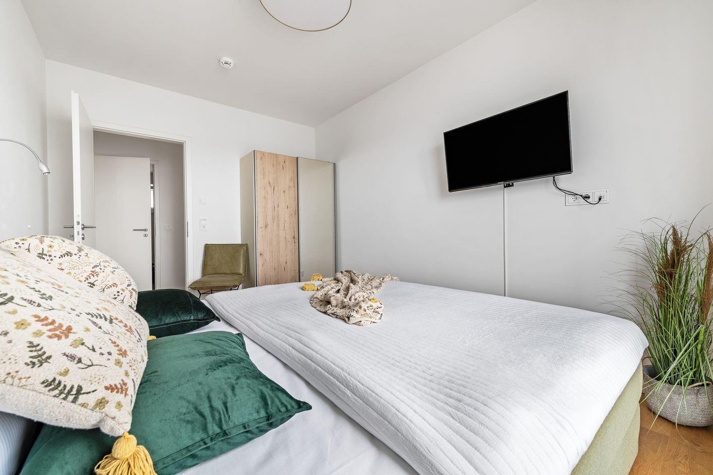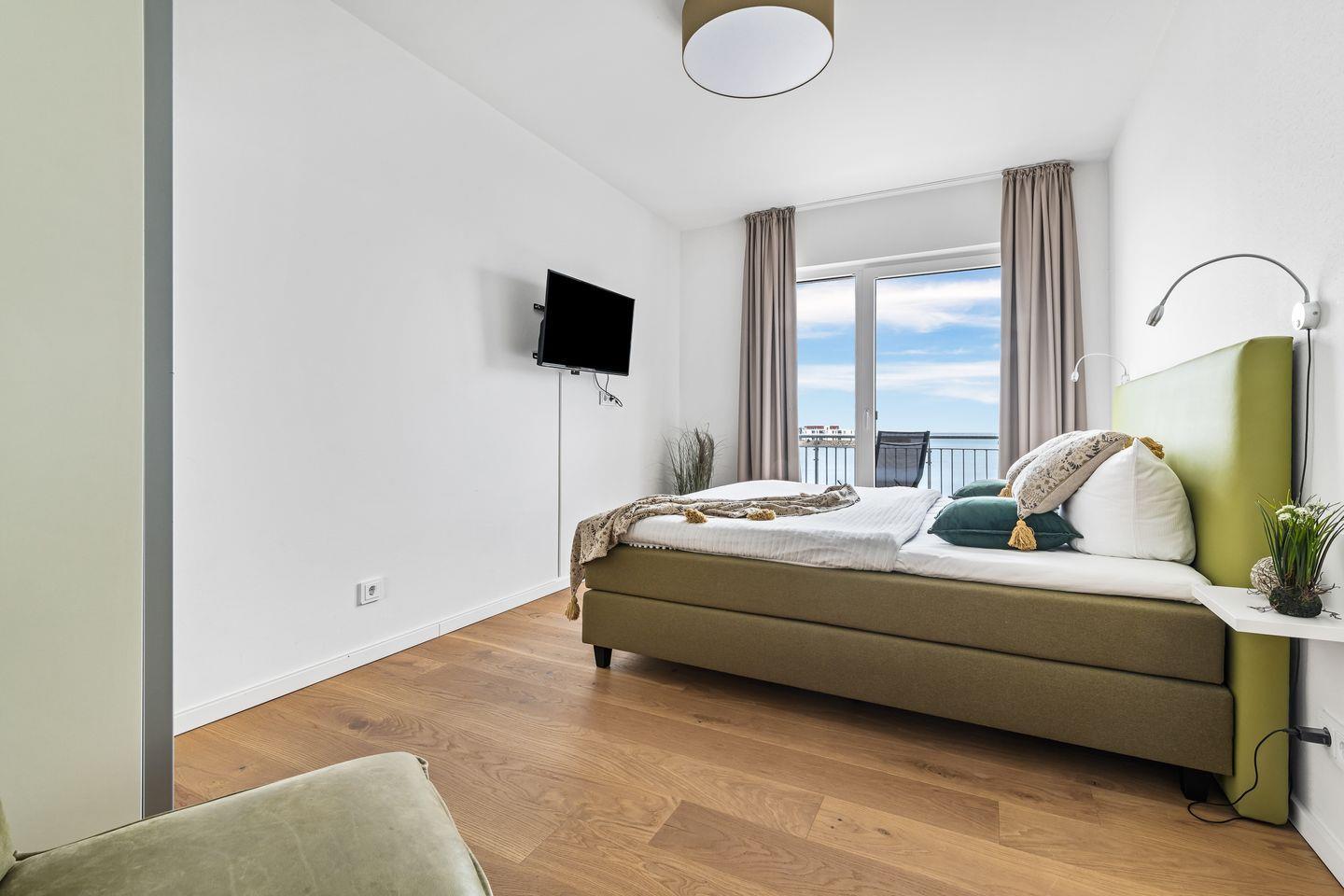Die bodentiefen Fenster und Boxspringbetten in den Schlafzimmern versprechen Aufwachen mit Meerblick und geruhsame Nächte. Eines der Schlafzimmer verfügt außerdem über einen Flatscreen.