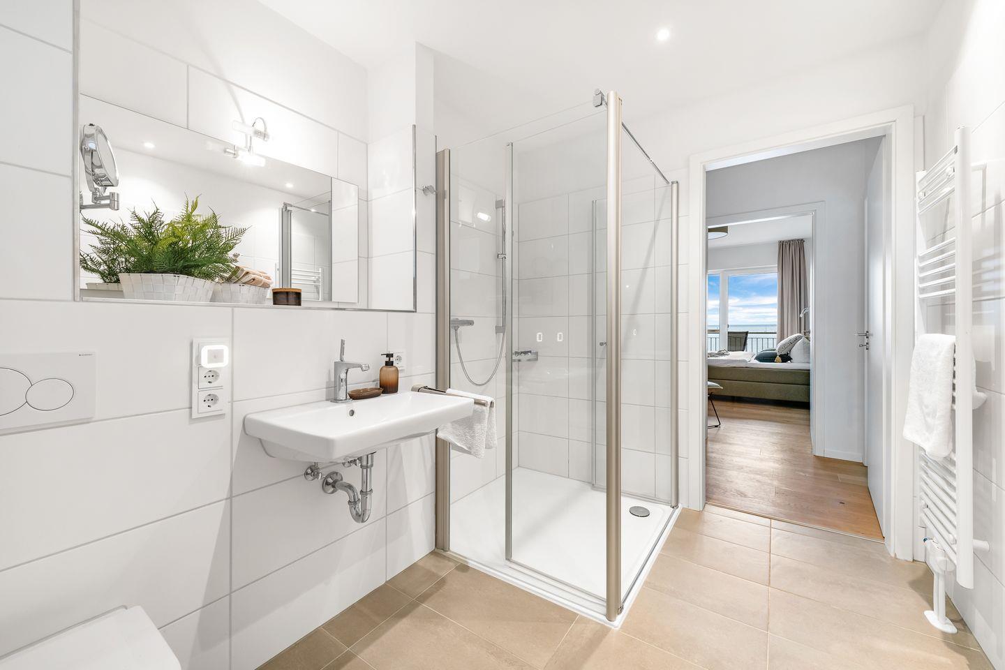 Das moderne Badezimmer mit bodengleicher Dusche lässt ebenfalls keine Wünsche offen.