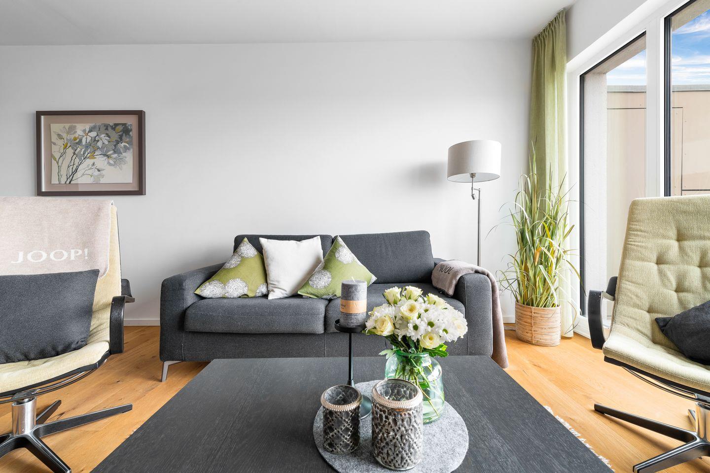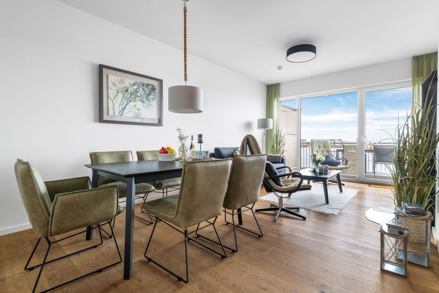 Vom Balkon lässt sich der Urlaubstag mit Meeresbrise in der Nase und einem dampfenden Kaffee in der Hand wunderbar starten während Segelschiffe vorbeiziehen. Der offen gestaltete Wohn- und Essbereich mit integrierter Küche und Panoramafront bietet den idealen Platz zum Beisammensein und Erholen.