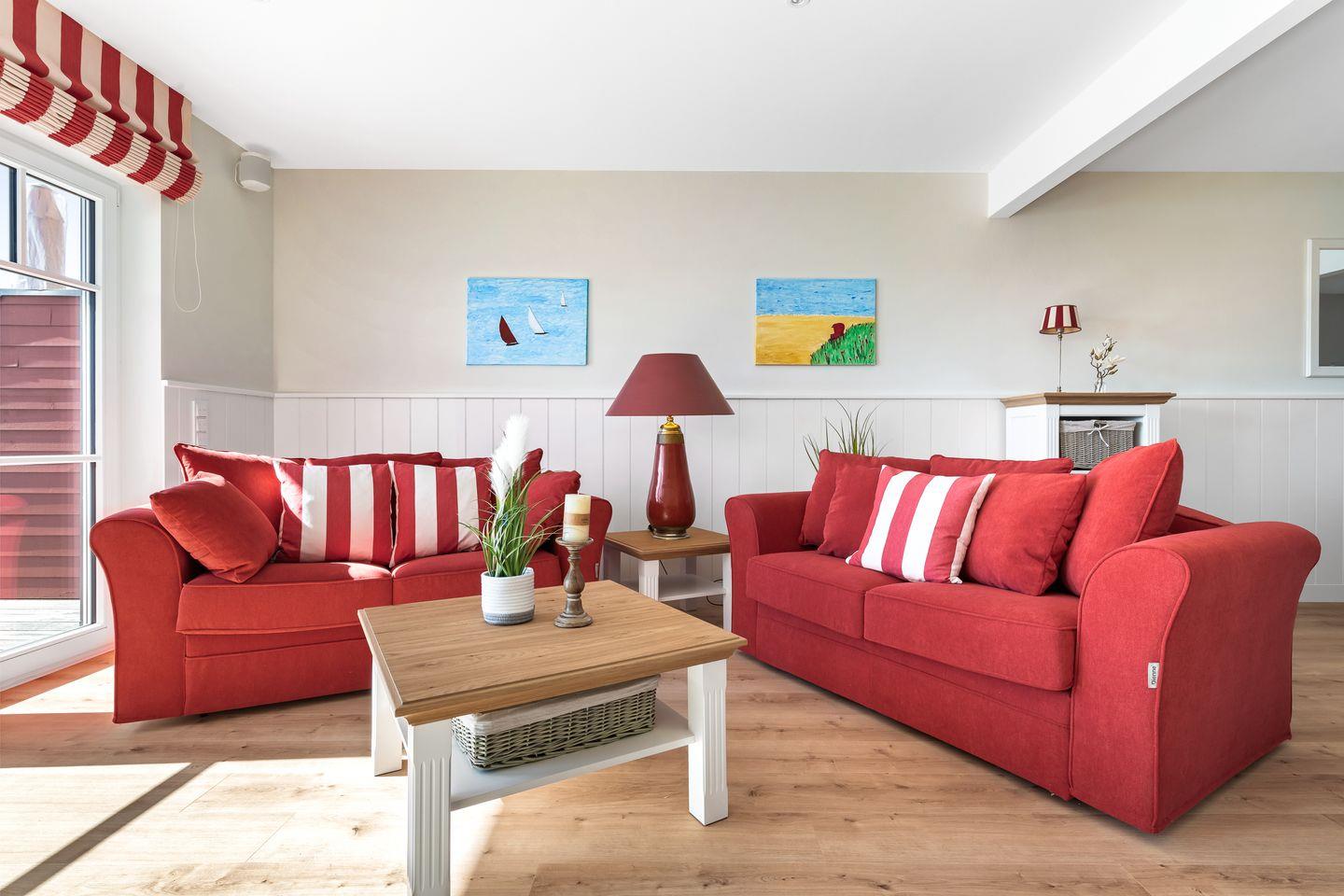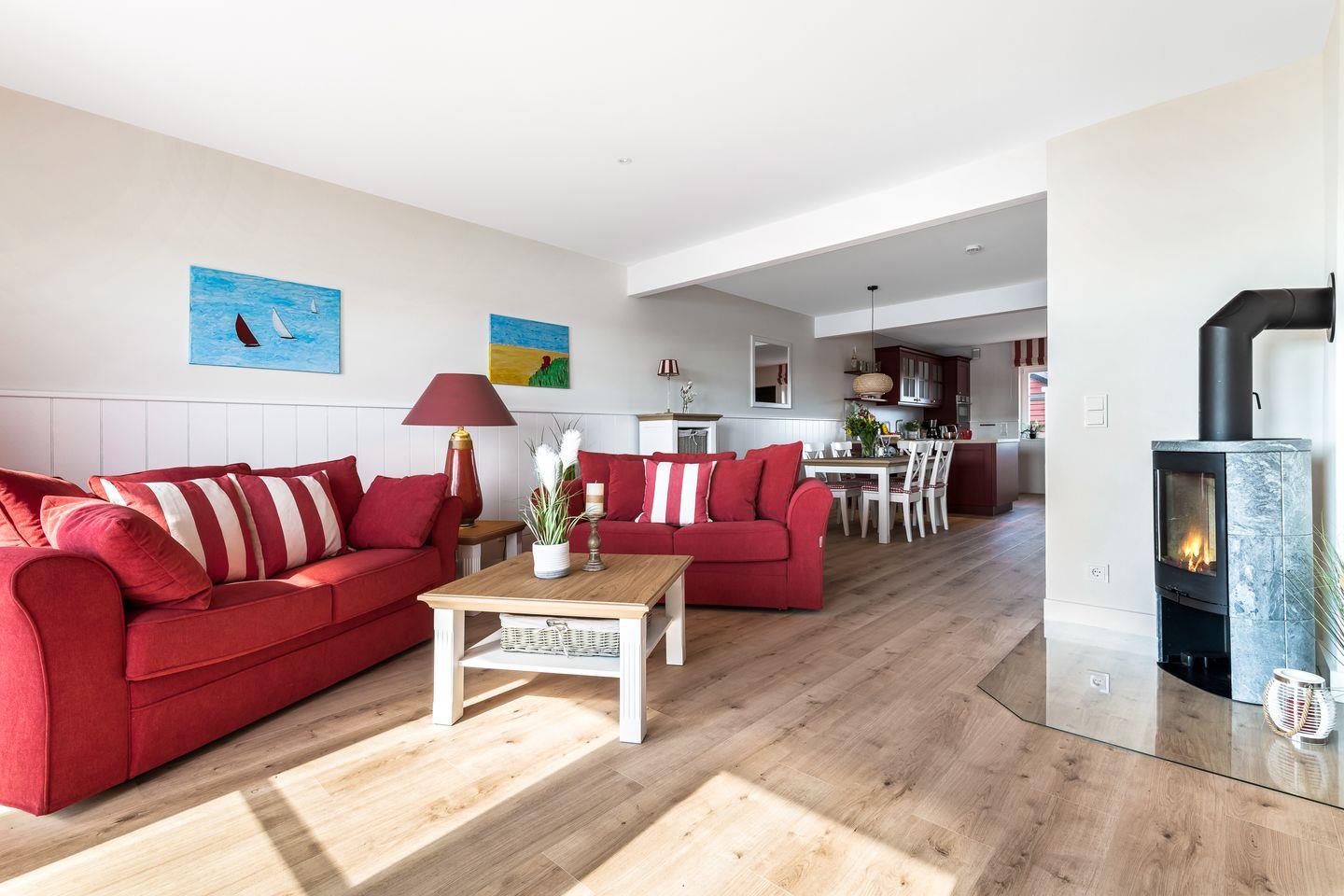 „Hafenliebe" – hier ist der Name Programm. Das romantisch eingerichtete, ca. 100qm große Ferienaus, sticht schon beim Vorbeifahren mit seiner roten Fassade unter den anderen Ferienobjekten heraus. Es wird genug Platz für bis zu 4 Personen geboten und überzeugt mit seiner herzlichen, in Rot gehaltenen Inneneinrichtung.