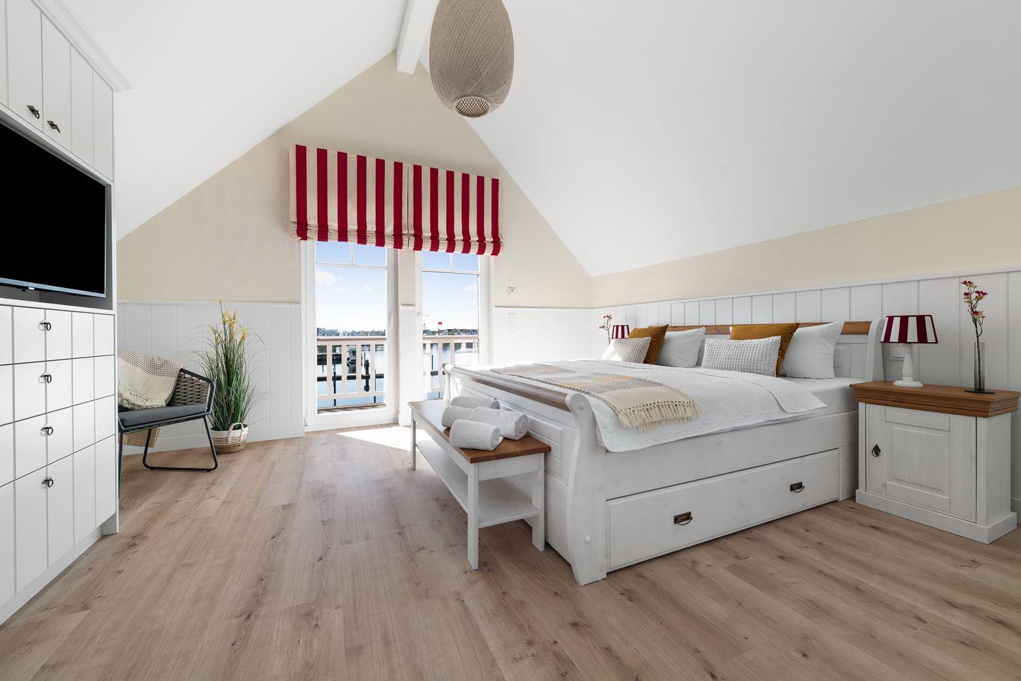 Im Obergeschoss des Ferienauses befinden sich zwei Schlafzimmer mit komfortablem Doppelbett (1,80m x 2,00m), großem Flatscreen, geräumigen Kleiderschrank und einem kleinen Sessel. In der Mitte des Obergeschosses befindet sich ein Badezimmer mit WC, Waschbecken, Spiegel, bodengleicher Dusche und toller finnischer Sauna. Das dem Wasser zugewandte Schlafzimmer verfügt zusätzlich über einen eigenen Balkon mit traumhaftem Panoramablick über den Hafen bis zur Ostsee. – Hier können Sie morgens die ersten Sonnenstrahlen genießen und den Vögeln lauschen.