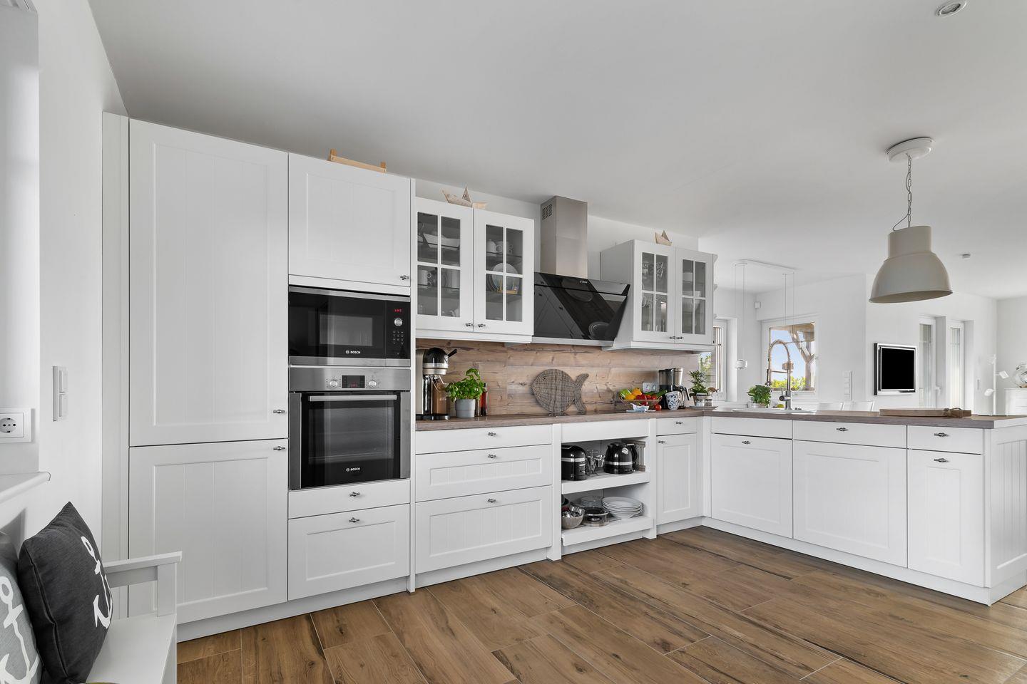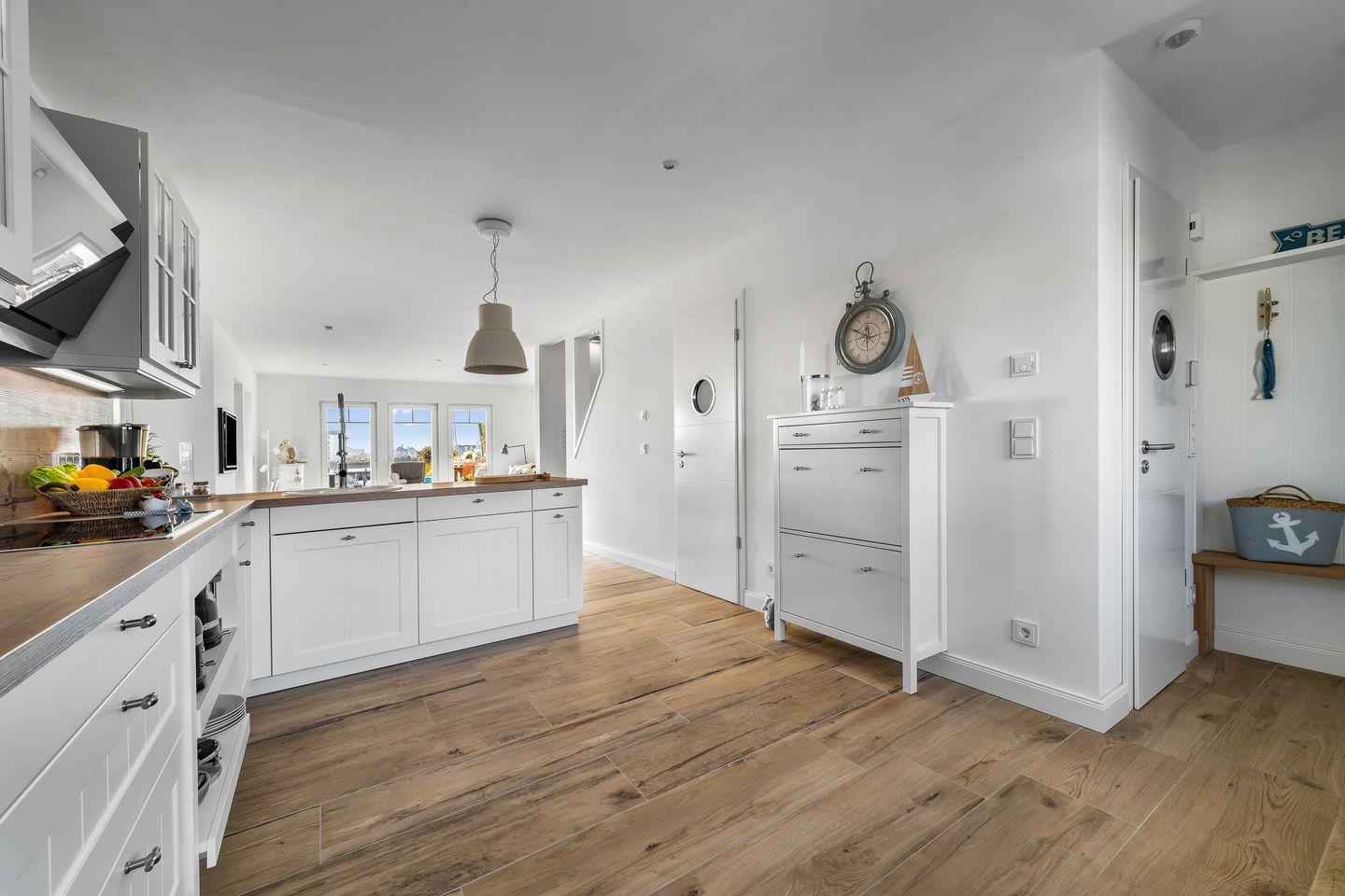 Nach dem Betreten des "Bootshauses" gelangen Gäste in einen kleinen Flur mit Garderobe und Gäste-WC, der direkt in die großzügige Küche übergeht. Die Küche ist mit weißen Landhausmöbeln und modernen Geräten ausgestattet.