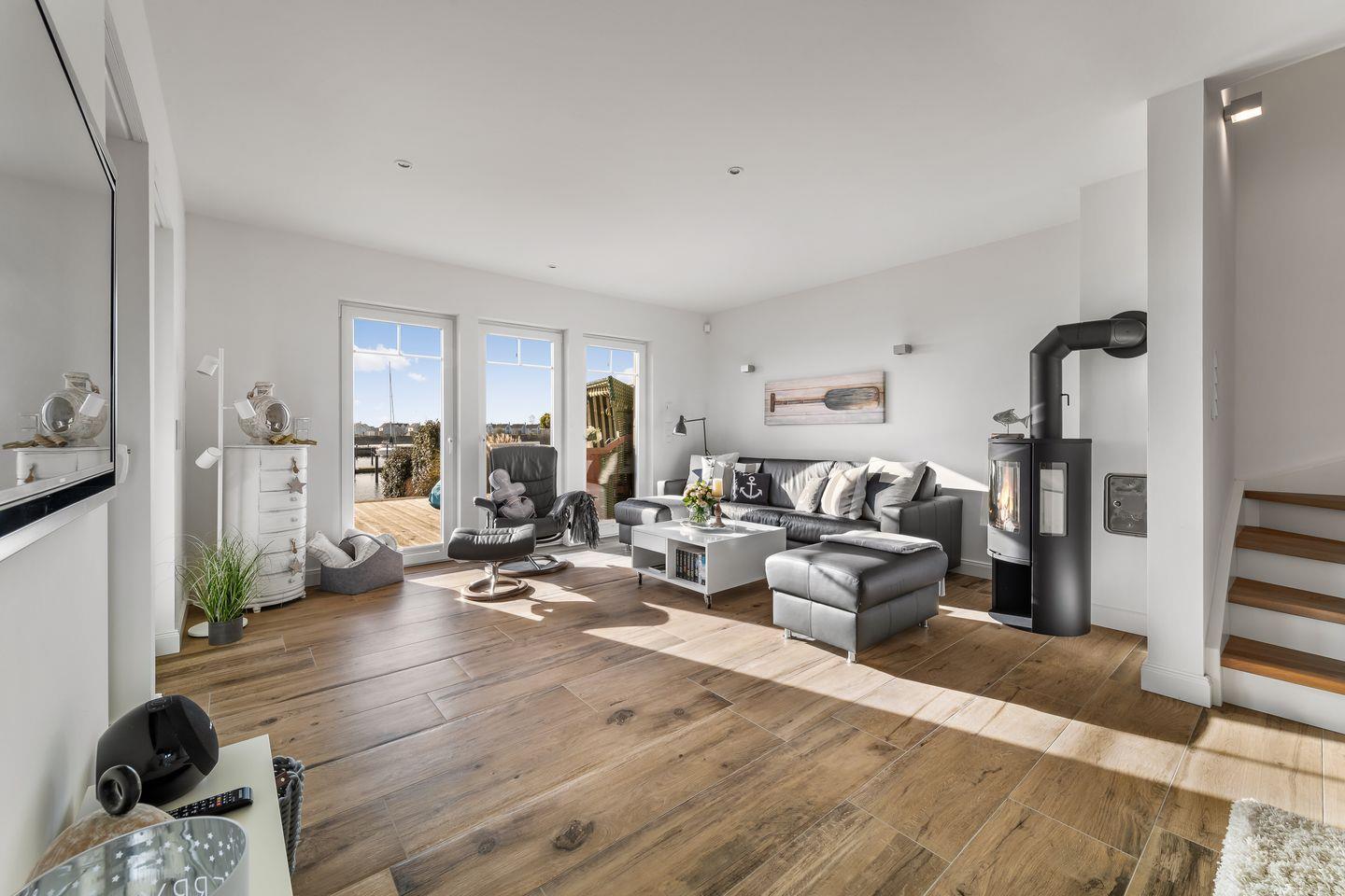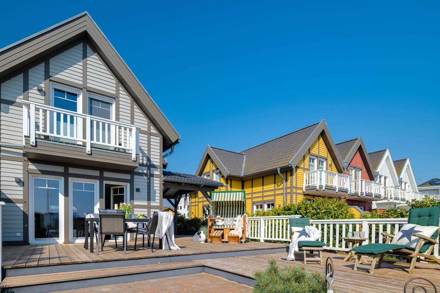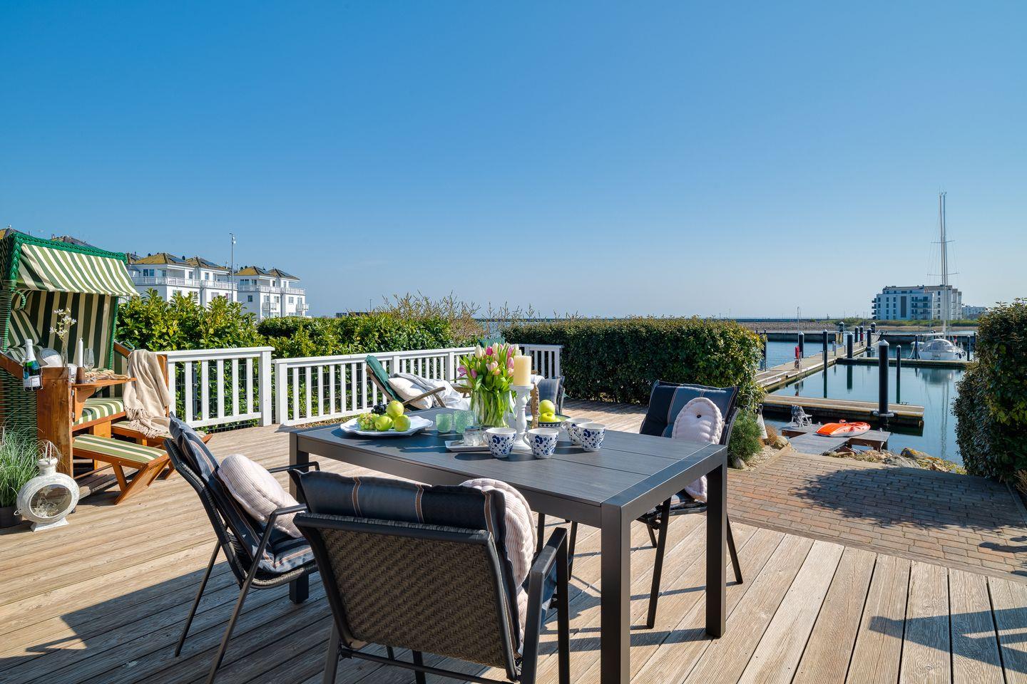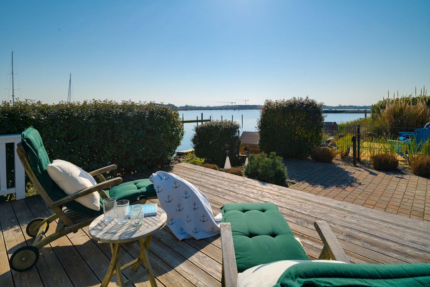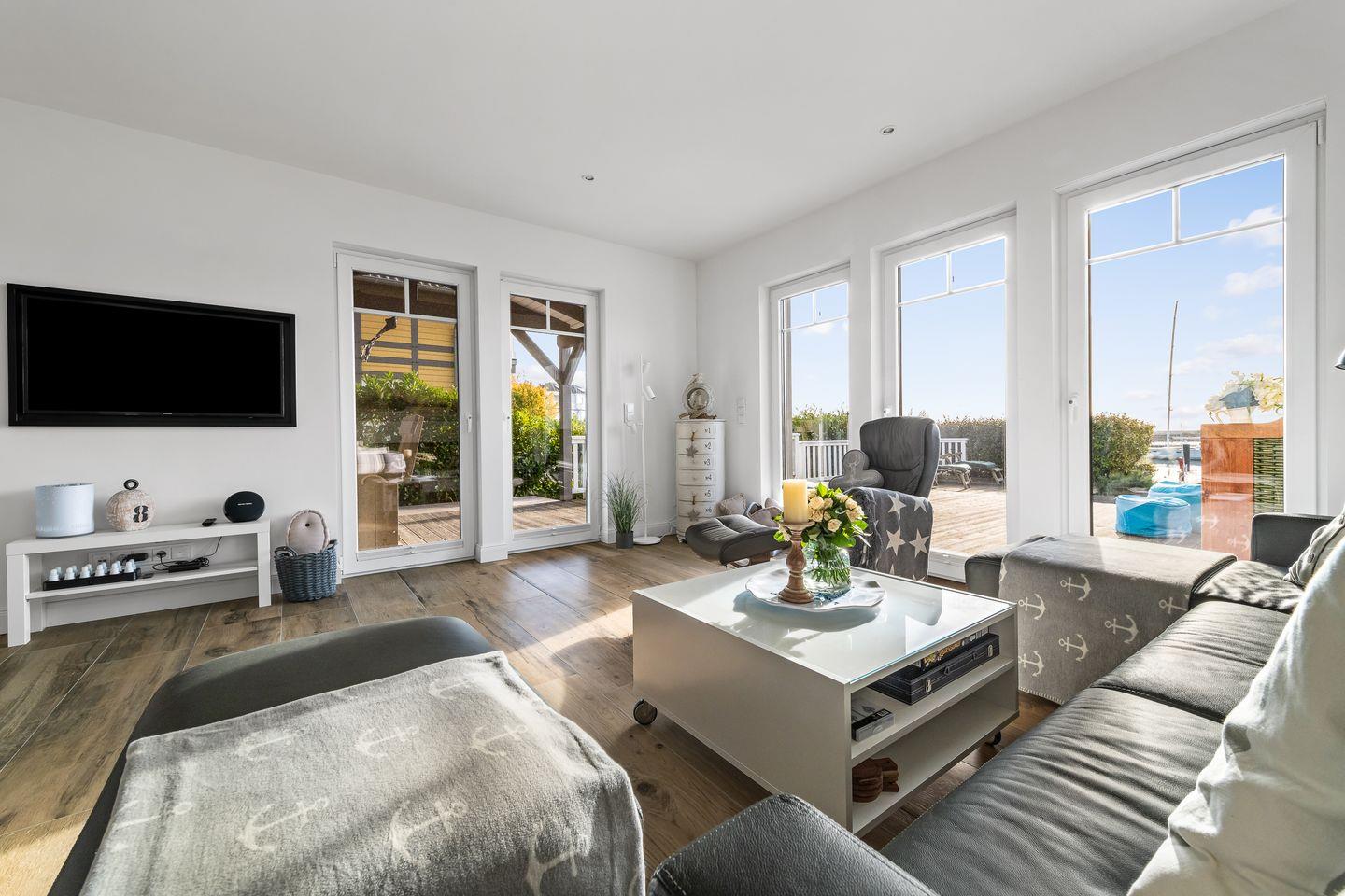 Zwei bodentiefe Fensterfronten lassen viel Licht in das "Bootshaus" und ermöglichen einen Urlaub mit Blick auf die Holzterrassen mit Strandkorb sowie den Yachthafen und die Ostsee. Zum Haus gehören ein eigener Steg mit Badeleiter.