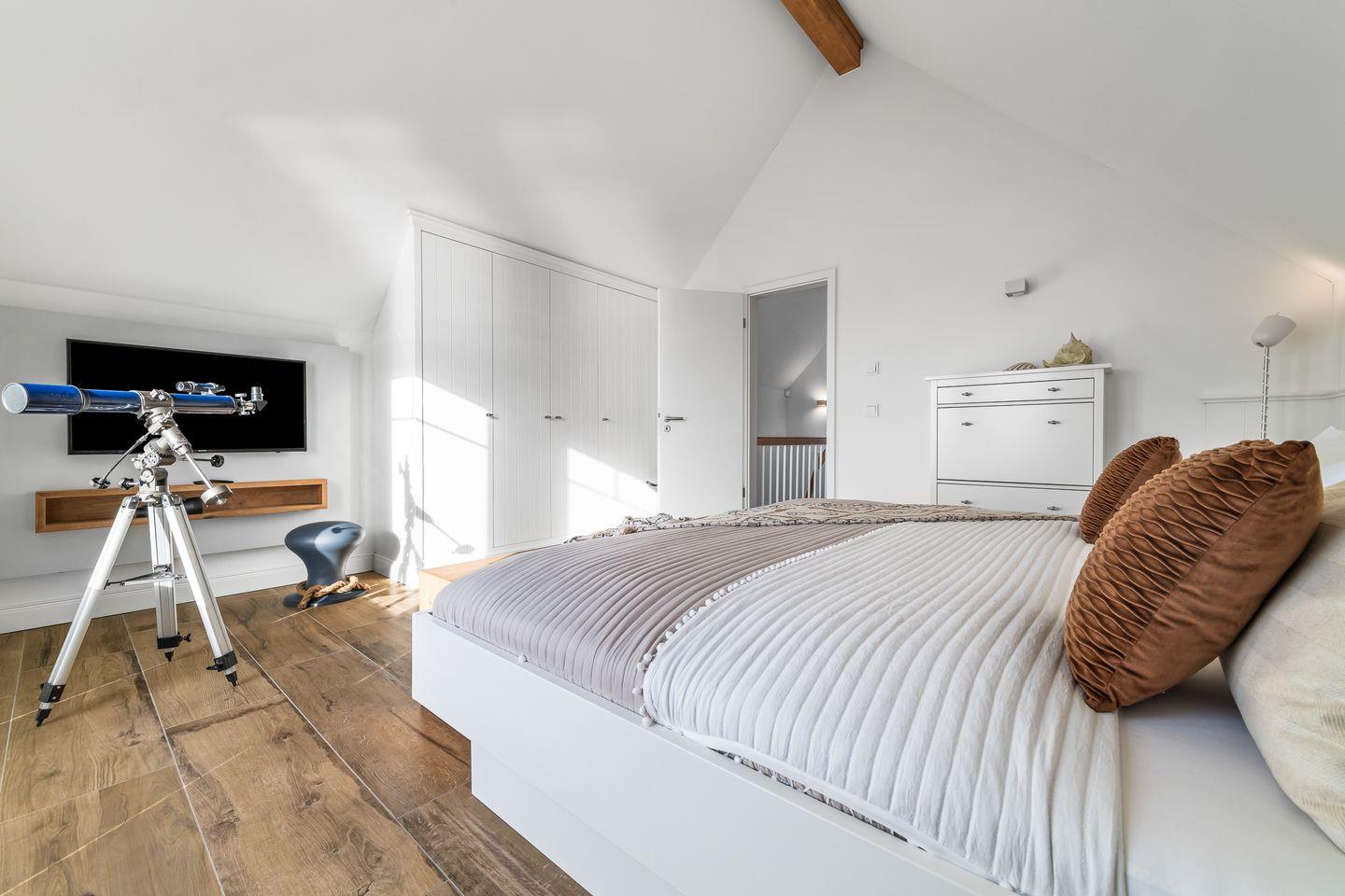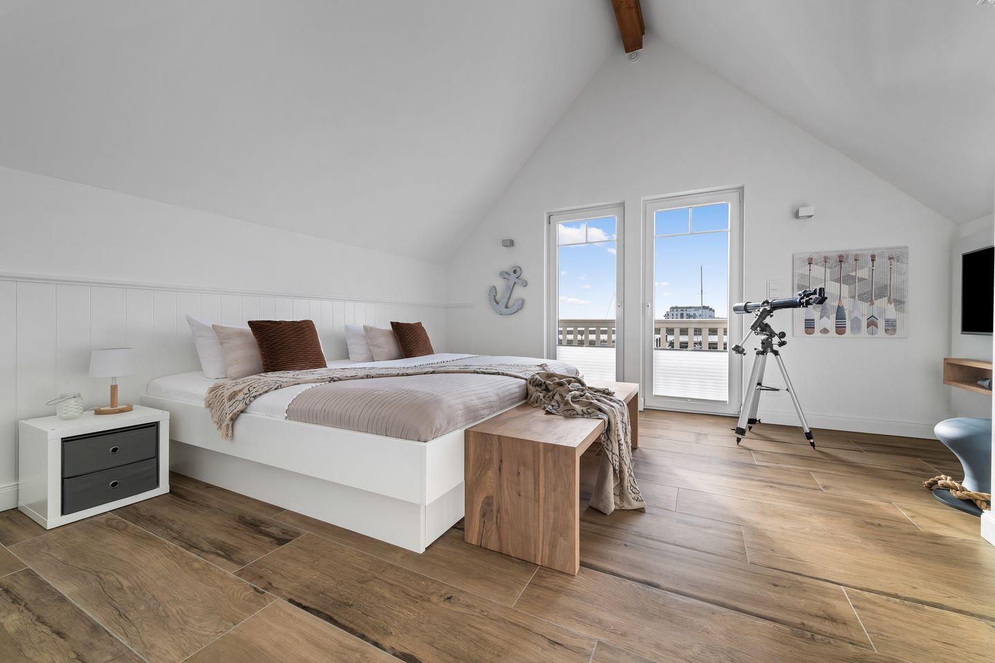 Eine Treppe führt zu den beiden Schlafzimmern im Obergeschoss des "Bootshaus". Ein Schlafzimmer ist mit einem Doppelbett, Kleiderschrank, Kommode, Nachttischen und einem Flachbildschirm ausgestattet. Der Balkon bietet einen Panoramablick auf das Wasser und den Hafen. Ein Teleskop steht zur Beobachtung der Natur zur Verfügung. Das zweite Schlafzimmer ist ähnlich ausgestattet, verfügt jedoch über zwei Einzelbetten statt eines Doppelbettes. Dieses Zimmer hat ebenfalls einen kleinen Balkon zur Landseite.