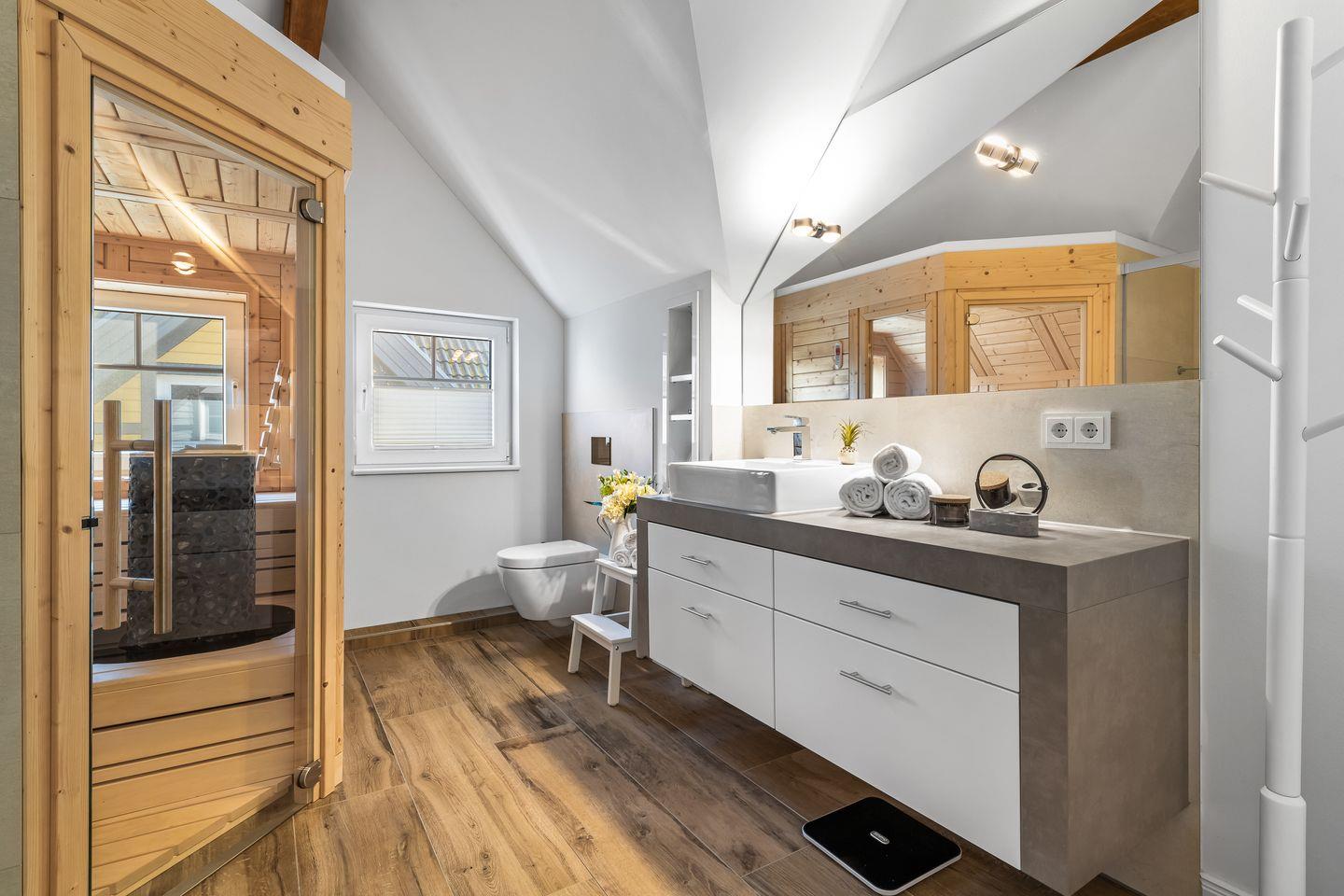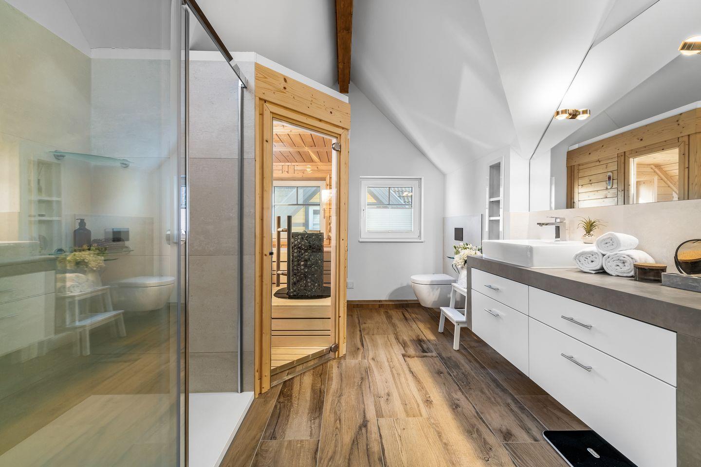 Das Badezimmer zwischen den Schlafzimmern ist mit einer ebenerdigen Regendusche, einer Sauna, einem Waschtisch mit Spiegel und einem WC ausgestattet.