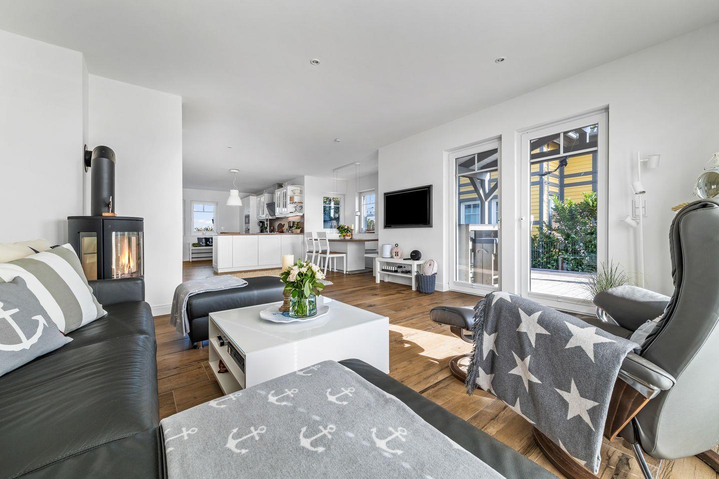 Das Wohnzimmer verfügt über eine Sitzecke und einen Kamin. Ein Sessel lädt zum Entspannen ein, und ein großer Flachbildschirm steht für Unterhaltung zur Verfügung. Dekorationselemente betonen den maritimen Charakter des Hauses.