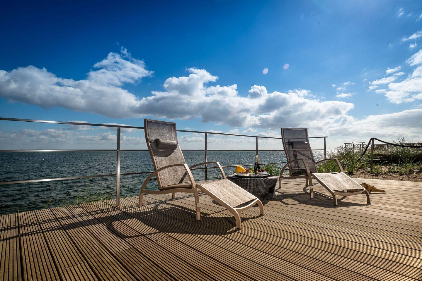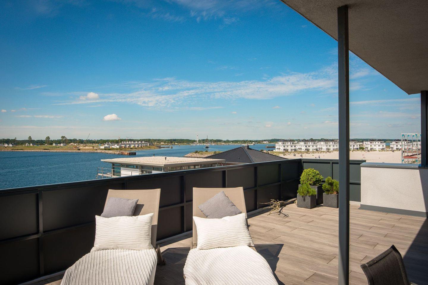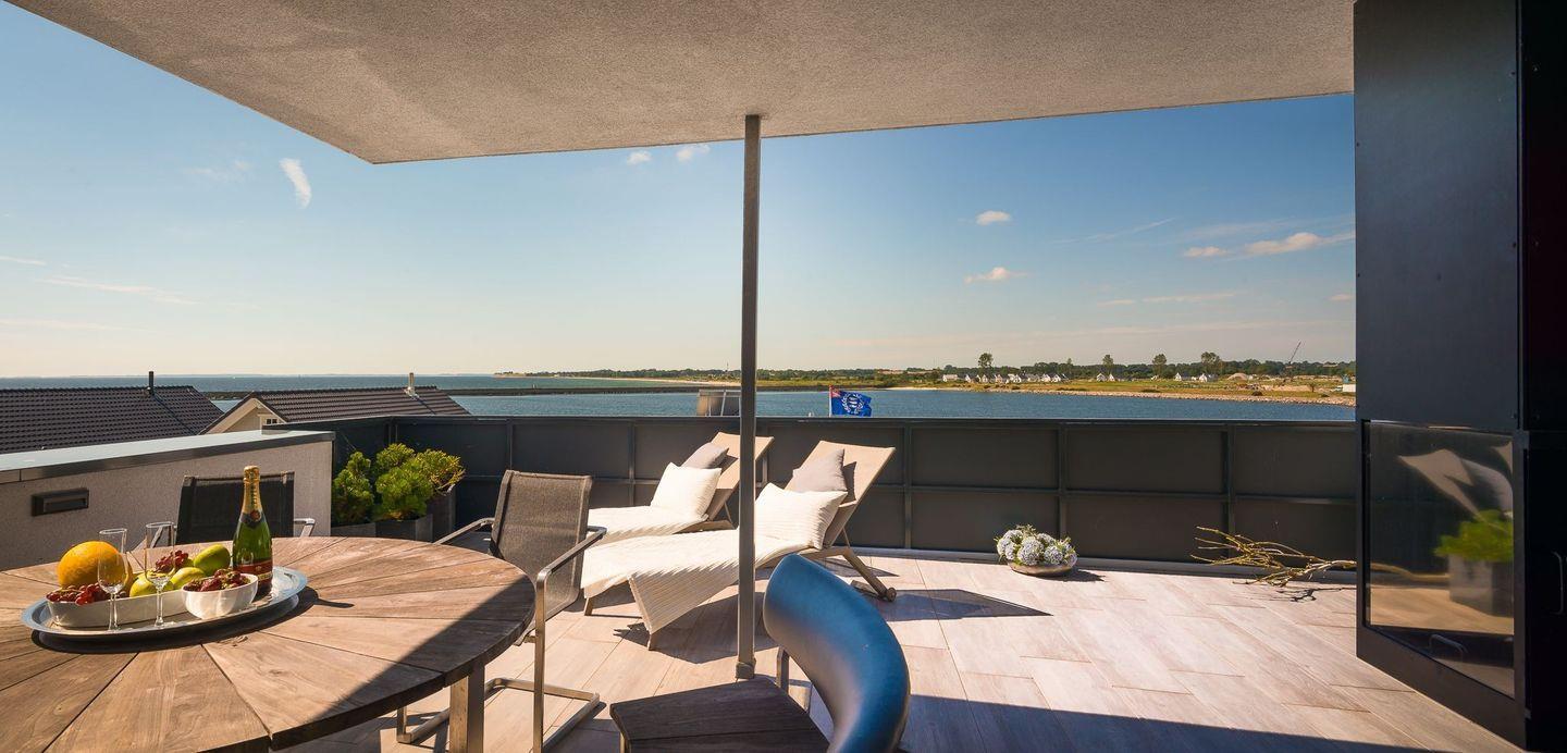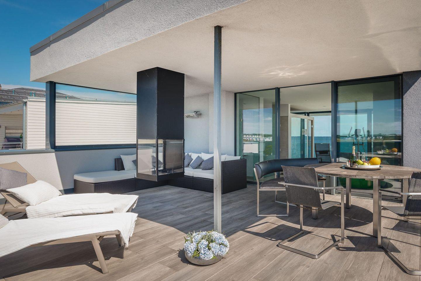 AUSSENBEREICHE ZUM VERLIEBEN Genießen Sie die Sonne und den Meerblick von mehreren Balkonen oder entspannen Sie auf der großen, teils überdachten Dachterrasse. Eine Feuerstelle und Heizstrahler sorgen auch an kühleren Abenden für gemütliches Beisammensein im Freien.