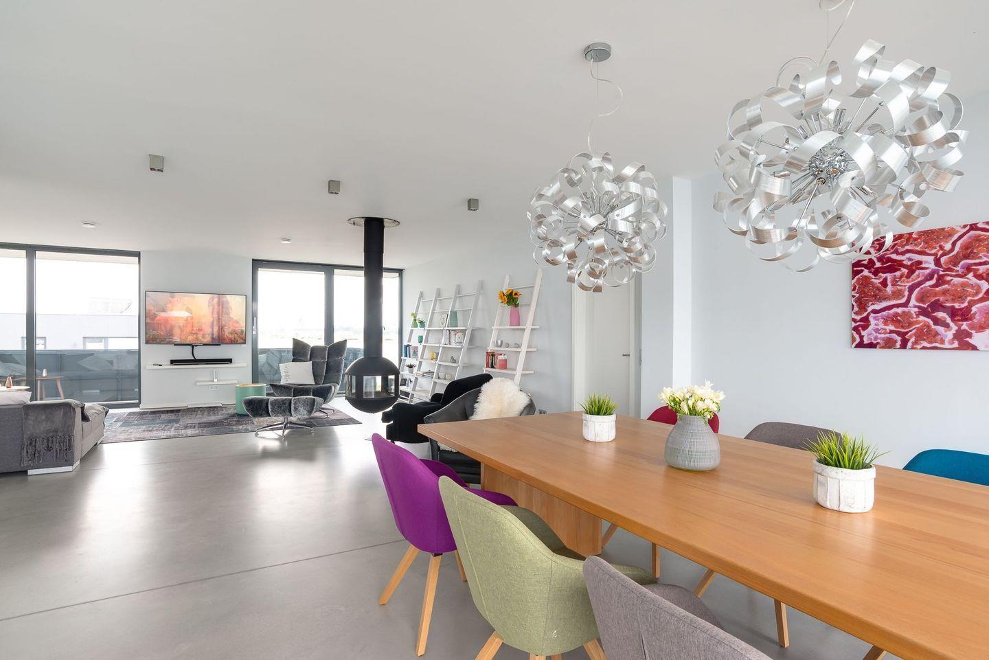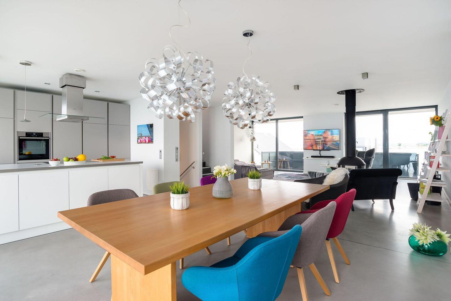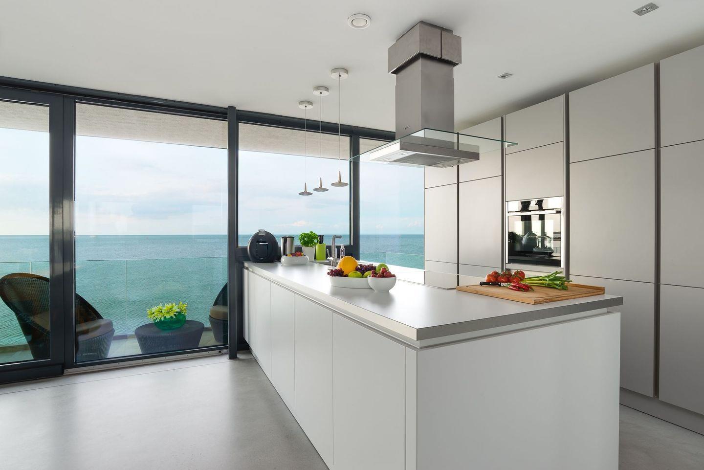 OSTSEEURLAUB MIT PANORAMABLICK: Im ersten Obergeschoss öffnet sich der Raum zu einem großzügigen Wohn- und Essbereich mit integrierter Küche. Ein hängender Kamin zentral im Raum sorgt für wohlige Atmosphäre, während Sie kochen, dinieren oder einfach nur die atemberaubende Aussicht genießen. Große Panoramafenster und Glasbalkone auf allen Seiten garantieren uneingeschränkte Sicht auf das offene Meer und die umliegende Landschaft.