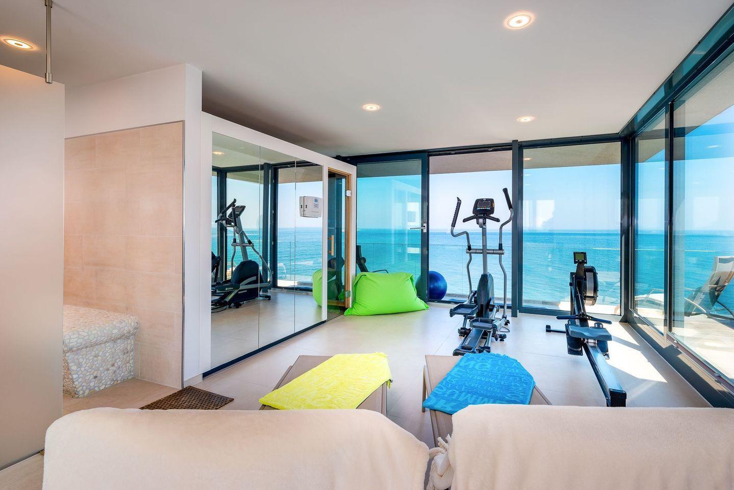 FITNESS UND ENTSPANNUNG: Das Highlight ist das Staffelgeschoss mit einem eigenen Fitnessraum, ausgestattet mit modernsten Geräten und einer Sauna. Große Fenster in der Sauna lassen Sie selbst beim Schwitzen den Blick auf die Ostsee genießen. Die anliegende Dachterrasse bietet absolute Privatsphäre, komfortable Lounge-Möbel und spektakuläre Ausblicke.