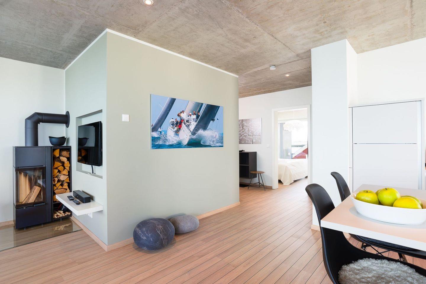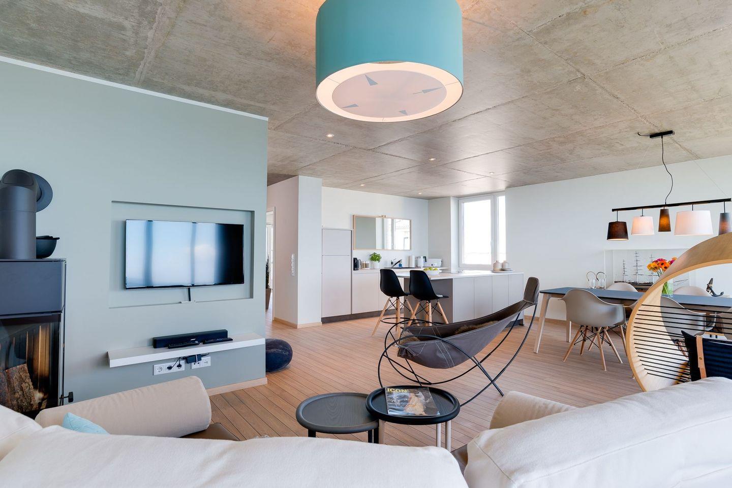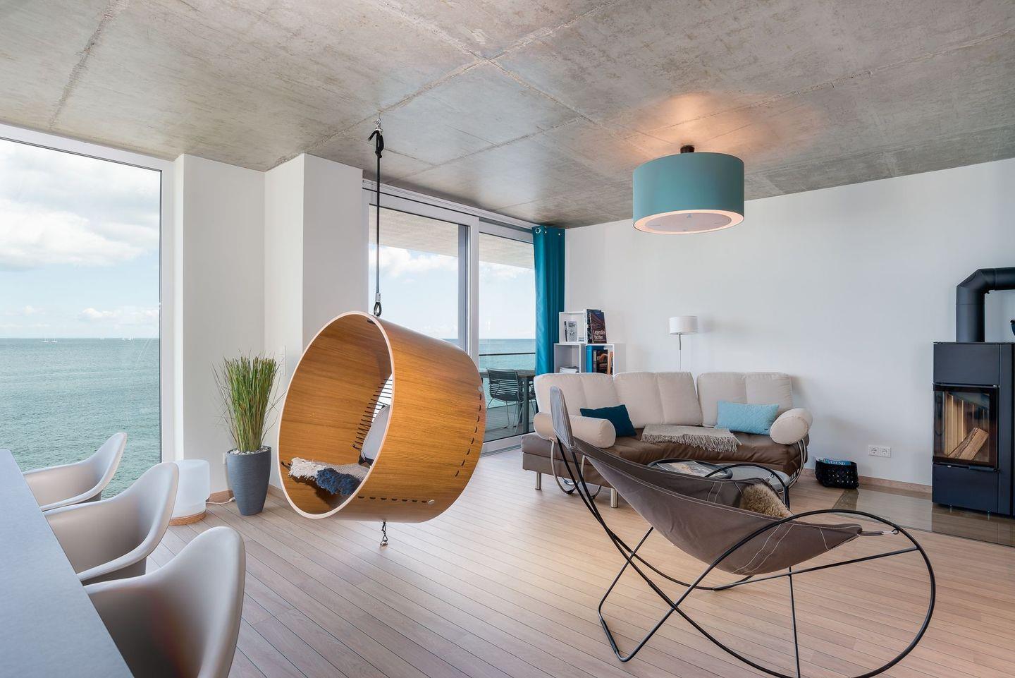 Auch bei schlechtem Wetter bietet die Wohnung allen Komfort. Auch bei schlechtem Wetter laden ein Kamin, eine finnische Sauna und ein Ruhebereich mit Blick auf die freie Ostsee zum Entspannen und ein.