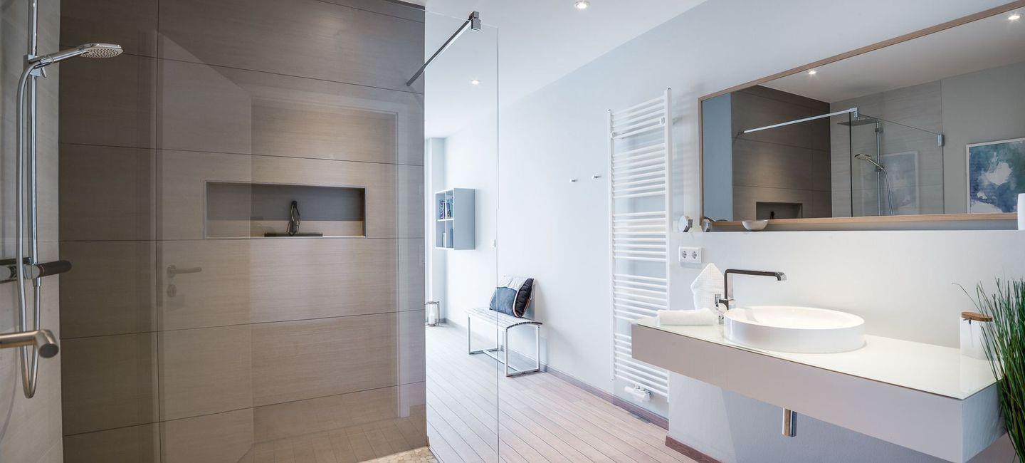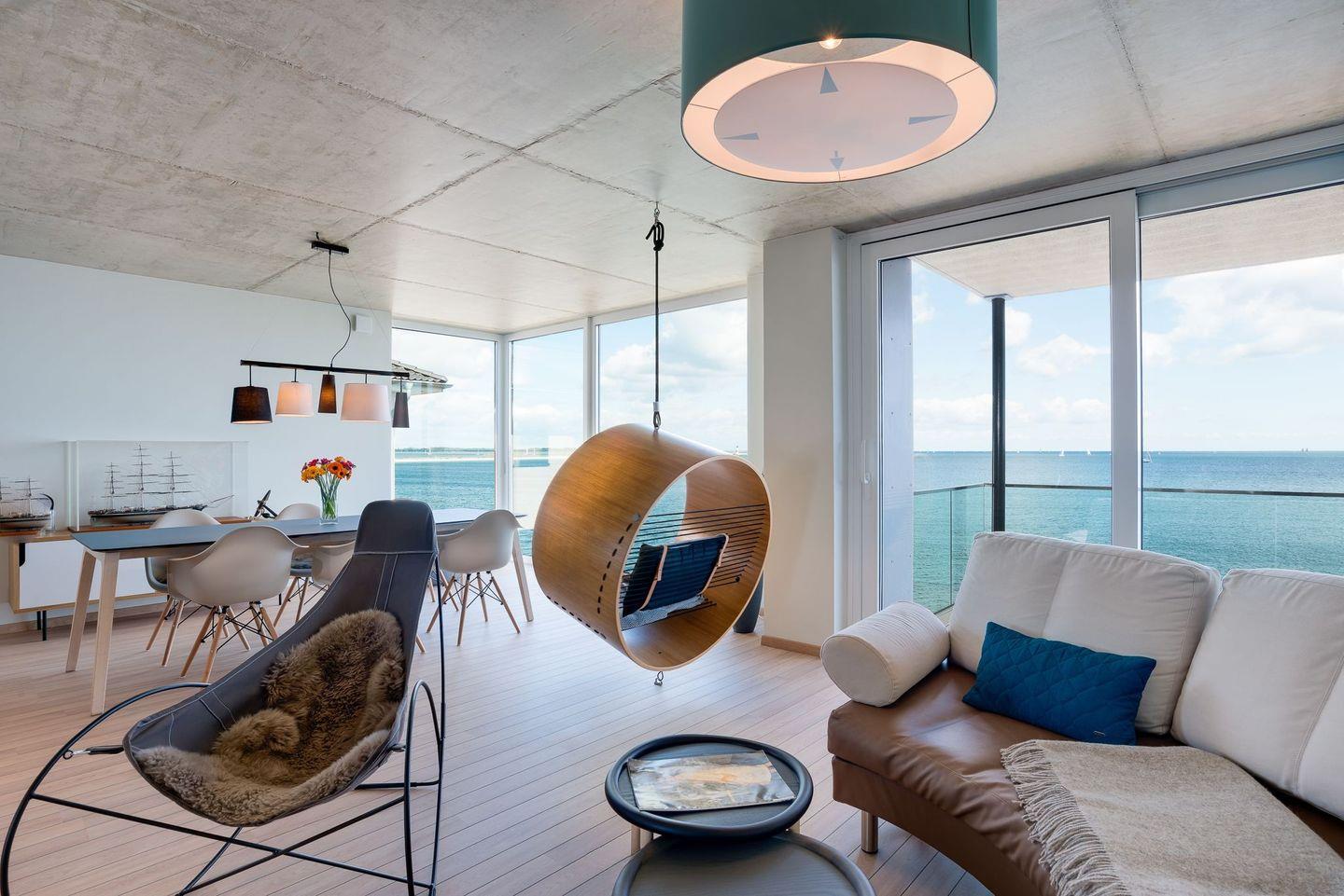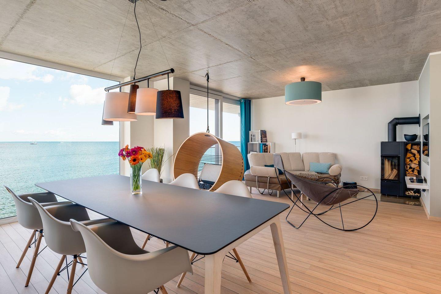 Die Ferienwohnung Weitblick wird im modernen skandinavischem Stil ausgestattet und besticht durch die große Panoramaglasfront, die unsere Gäste einen freien Blick auf die Ostsee genießen lässt.