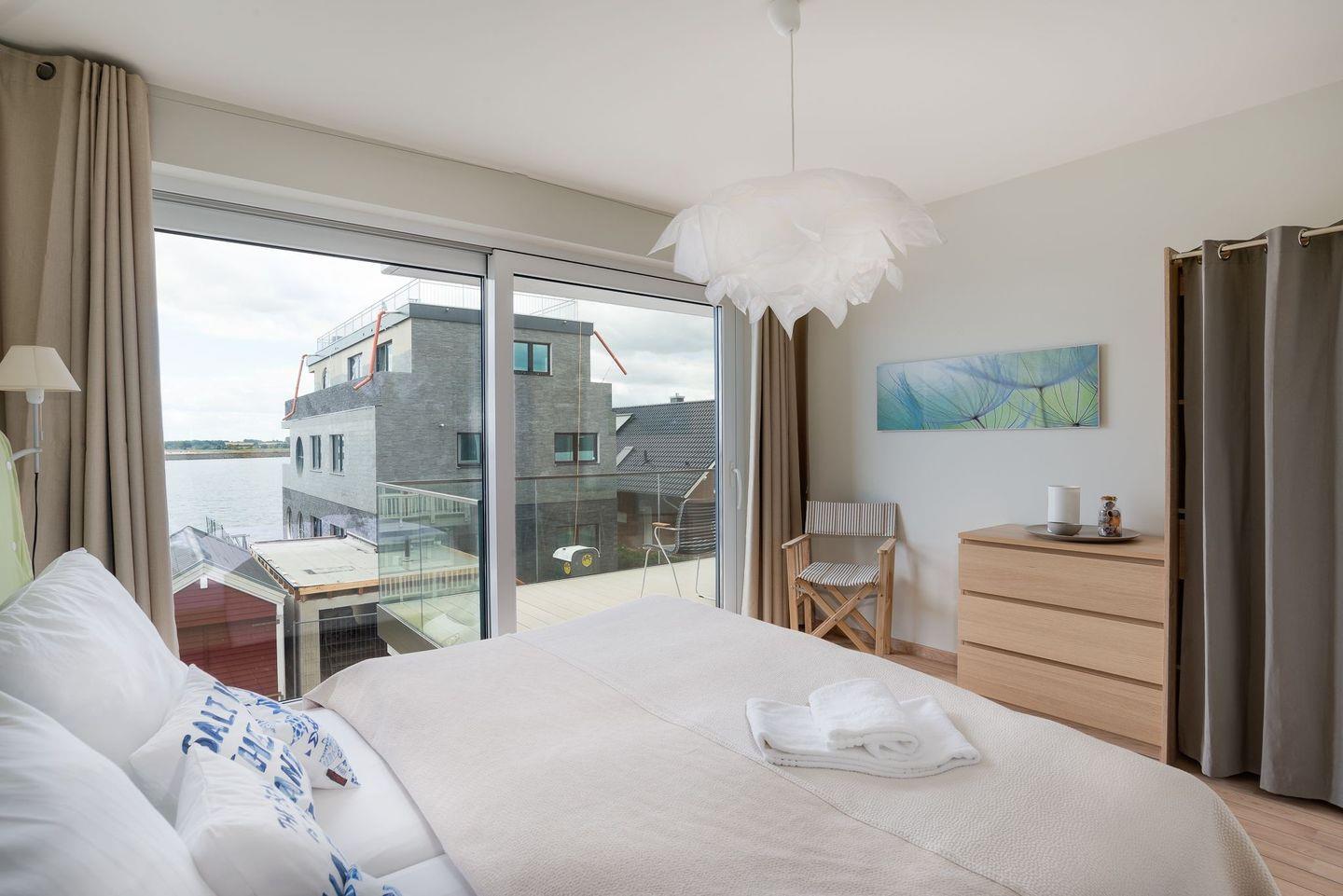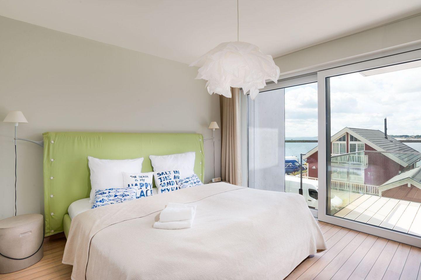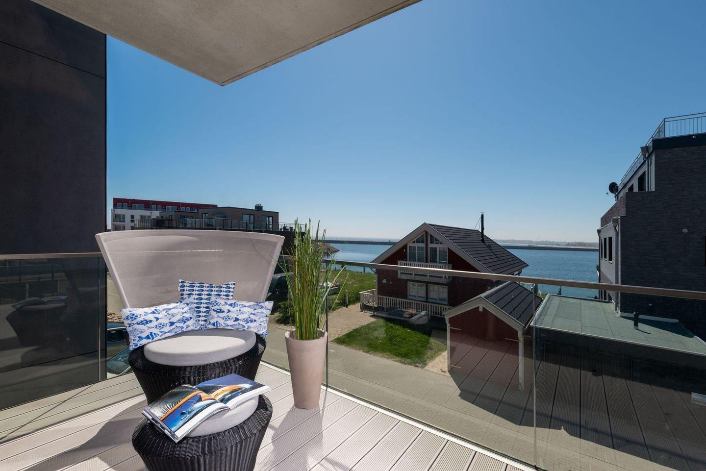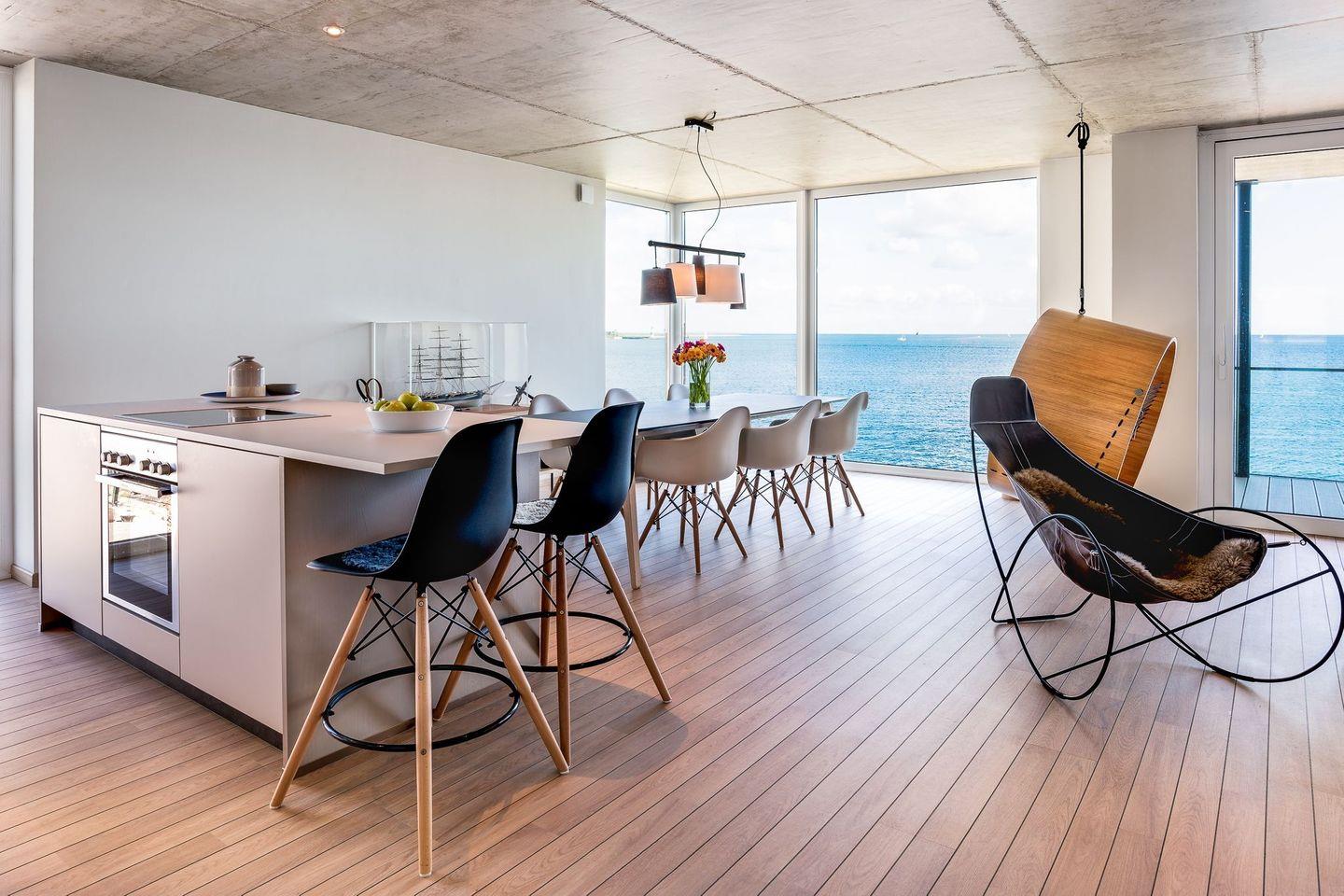 Eine hochwertige Wohnlandschaft, ein extravaganter Kamin, eine komplett ausgestattete Küche und der angrenzende Essbereich bieten Komfort auf ganzer Linie. Von hieraus auf den großen Balkon treten und die frische Ostseeluft einatmen oder beim Sundowner den Sonnenuntergang über der Schlei bewundern. Die hochwertige Möblierung und Überdachung des Balkons ermöglicht auch bei Regen den Aufenthalt an der frischen Luft. Am Morgen beim genussvollen Frühstück den Segelschiffen und Fischerbooten beim Ein- und Auslaufen aus der Schleimündung zuschauen und entspannt in den Tag starten.