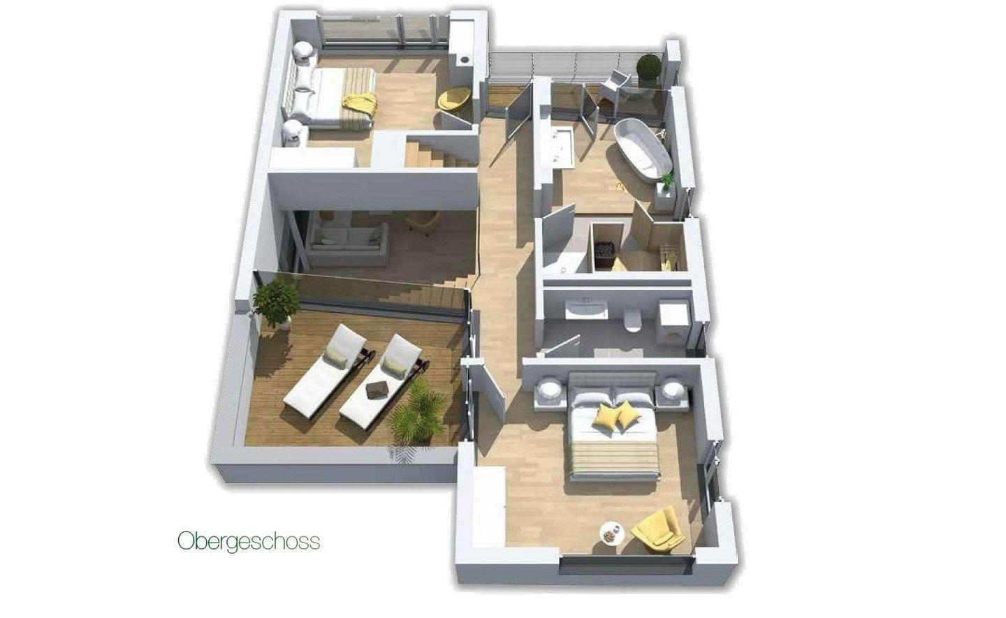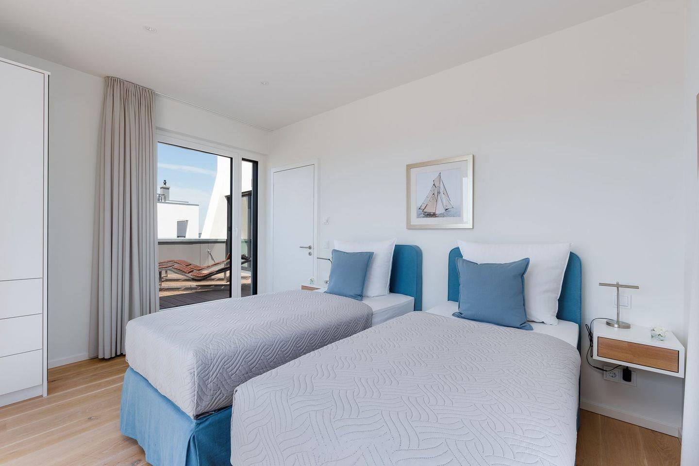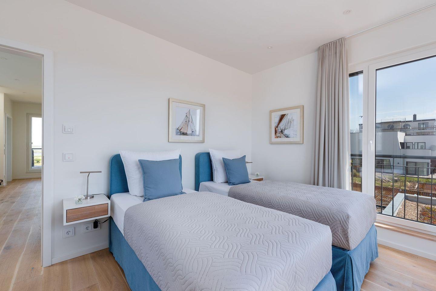 Ein weiteres Schlafzimmer mit zwei Einzelbetten, welche bei Bedarf zusammen geschoben werden können, Einbauschränken, Flatscreen-TV und ein separates Badezimmer mit Dusche, WC und Waschtisch befinden sich ebenfalls im Obergeschoss. Eine nach Süden ausgerichtete Terrasse mit Liegen ermöglicht unseren Gästen auch auf dieser Wohnebene die Sonne entspannt zu genießen.