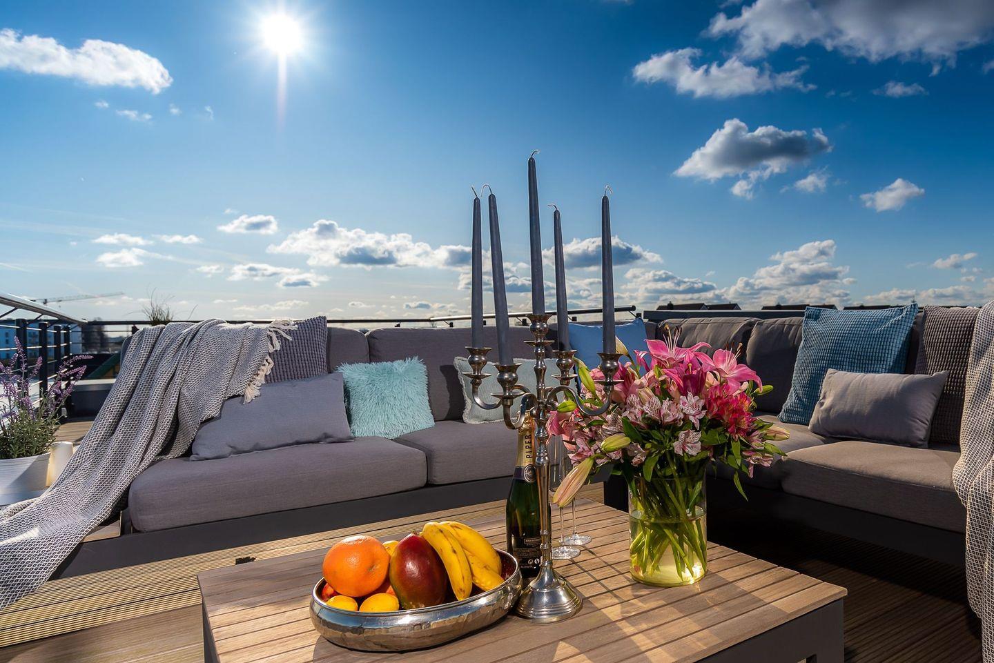 Die große umlaufende Sonnenterrasse wird über eine der drei großen Schiebetüren betreten und bietet eine Sitzgruppe, einen besonderen Außengrill und stilvolle Loungemöbel. Hier kann nach Herzenslust gefrühstückt oder aber am Abend bei Gegrilltem der Sundowner genossen werden.