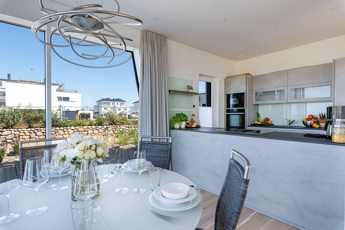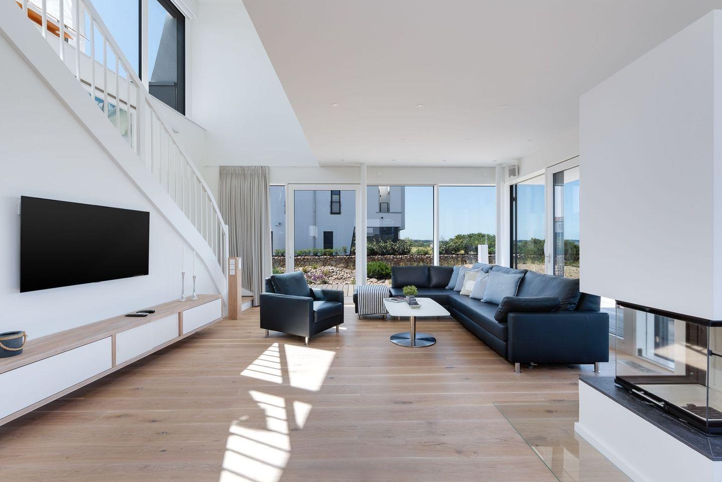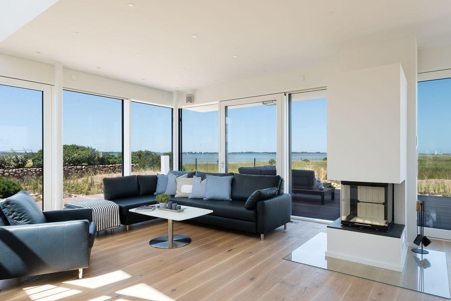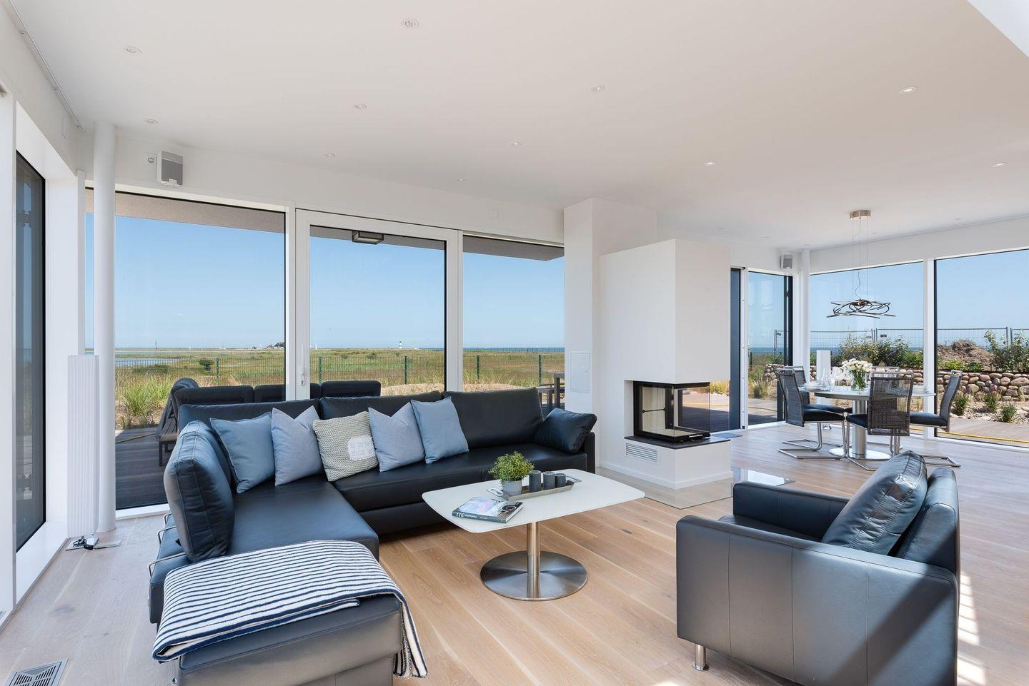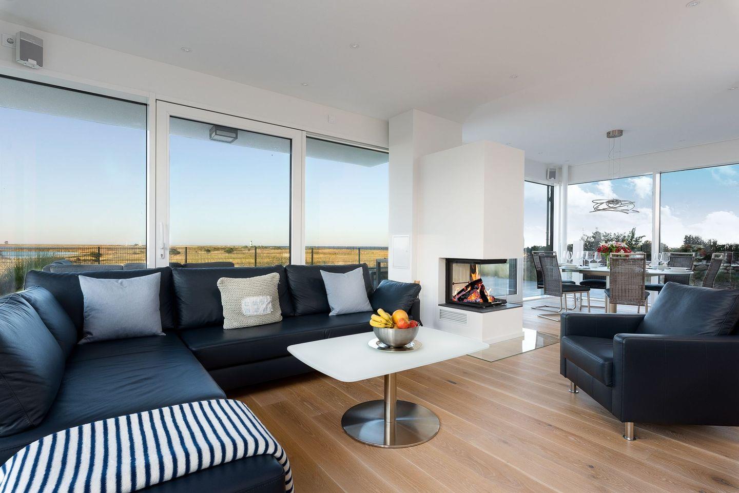 Das Erdgeschoss des „Aquarius" wird dominiert durch den ca. 43 qm großen lichtdurchflutete Wohnbereich, der mit seiner dreiseitigen Panoramaverglasung den Blick auf die Ostsee, die wunderschön gestaltete Gartenanlage und das Meer aus jedem Winkel ermöglicht. Die im Wohnbereich integrierte voll ausgestattete Küche mit Kochinsel lässt jeden Gast zum Hobbykoch werden. Ein gemauerter Kamin neben dem gemütlichen Ecksofa, ein großer Flatscreen-TV und der stilvoll gestaltete Essbereich lassen diesen Raum zum Dreh- und Angelpunkt des Urlaubs werden.
