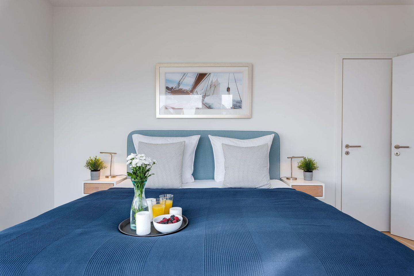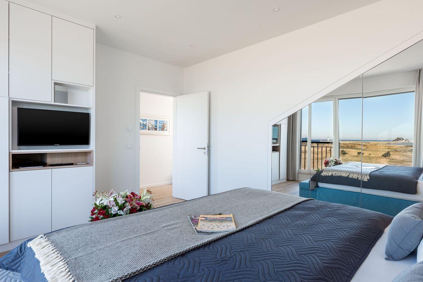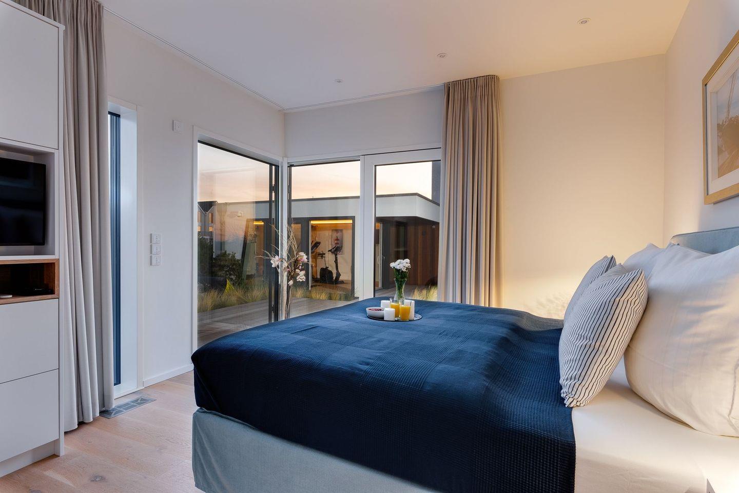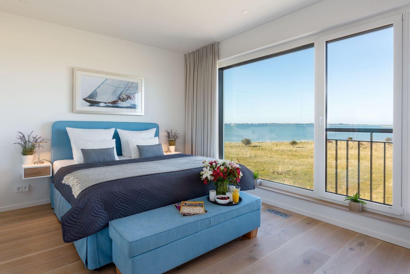 Neben dem großen Wellnessbadezimmer befindet sich auch der Masterbedroom mit großem Boxspringbett, verspiegeltem Einbauschrank und großen Panoramafenster auf dieser Ebene des Hauses. Am Morgen erwachen und mit einer Tasse Kaffee im Bett in den Tag starten. Dabei dem Rauschen des Meeres zuhören und den Blick auf den Leuchtturm von Schleimünde genießen. Schöner kann ein Urlaubstag nicht beginnen.