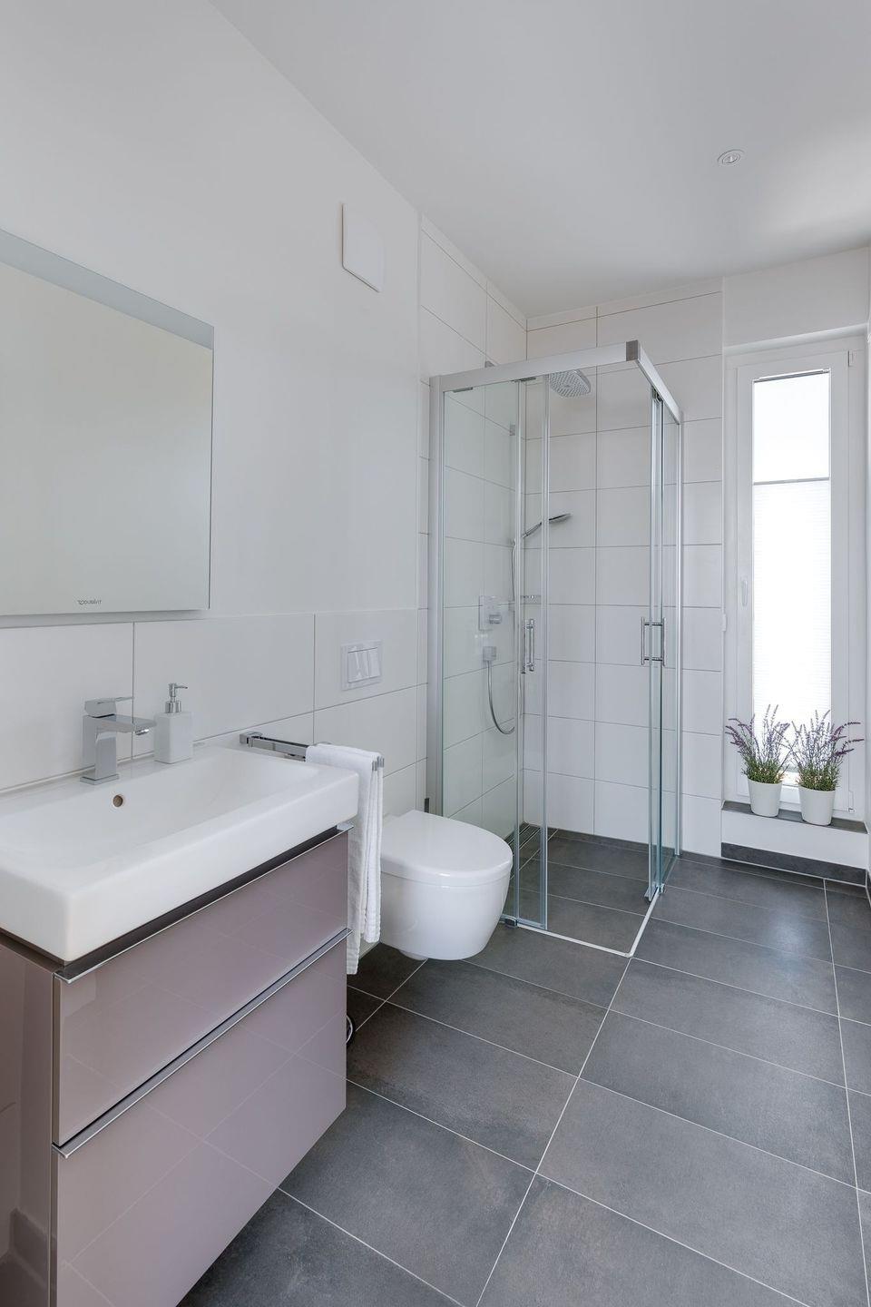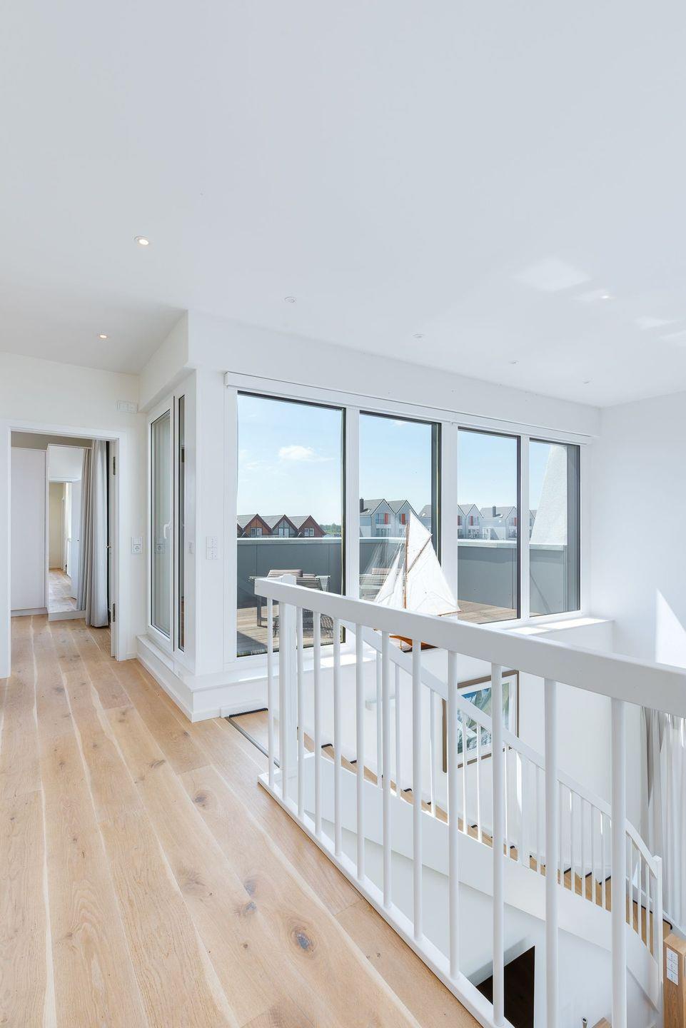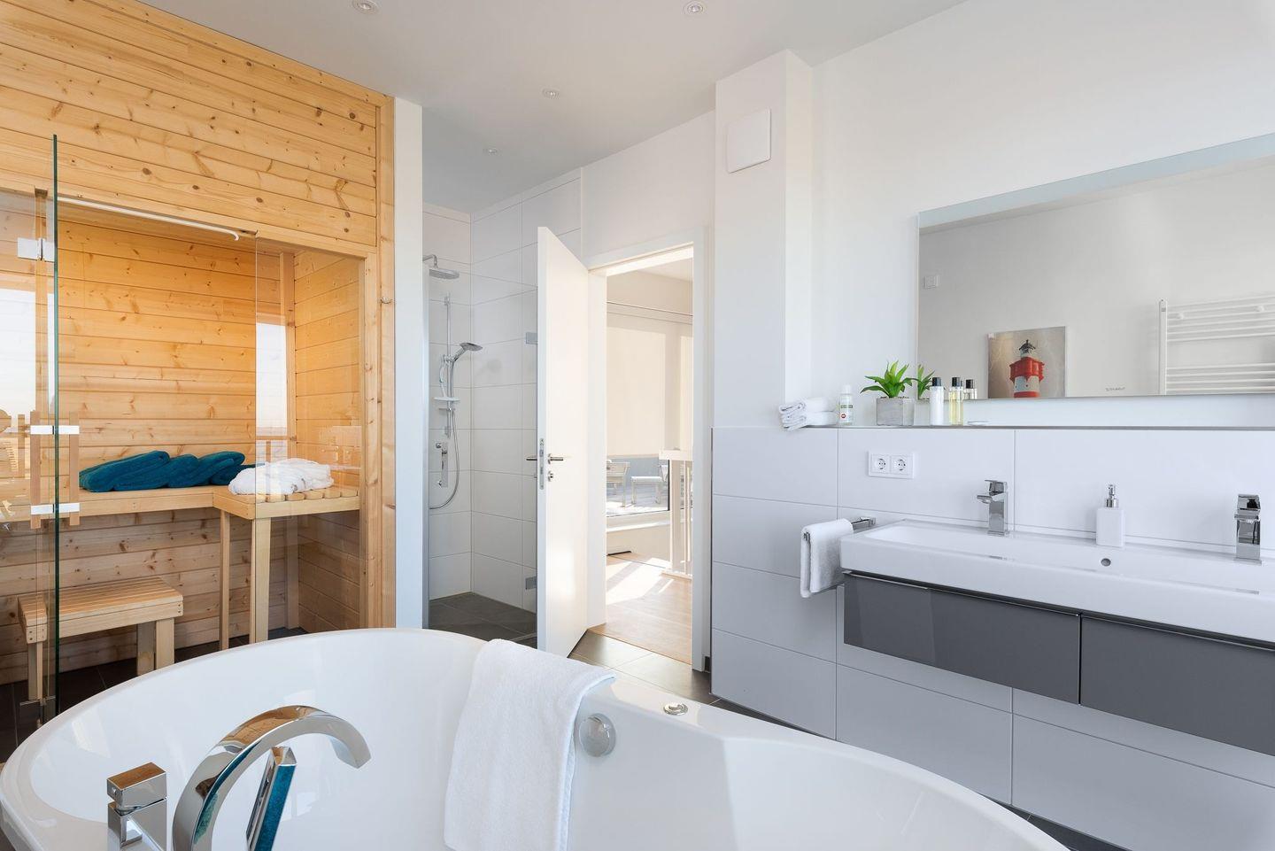 Über eine Treppe mit Galerie im Obergeschoss gelangen unsere Gäste in den Wellnessbereich, der neben einer freistehenden Badewanne, einer großen finnischen Sauna, einer Regendusche und Doppelwaschtisch keine Wünsche offen lässt. Die große Schiebetür ermöglicht sowohl beim Duschen, Baden und Saunieren den Blick auf das Meer und die vorbeiziehenden Segelboote. Ein Balkon schließt an den Wellnessbereich an, so dass hier direkt nach der Sauna die frische Meeresluft eingeatmet werden kann.