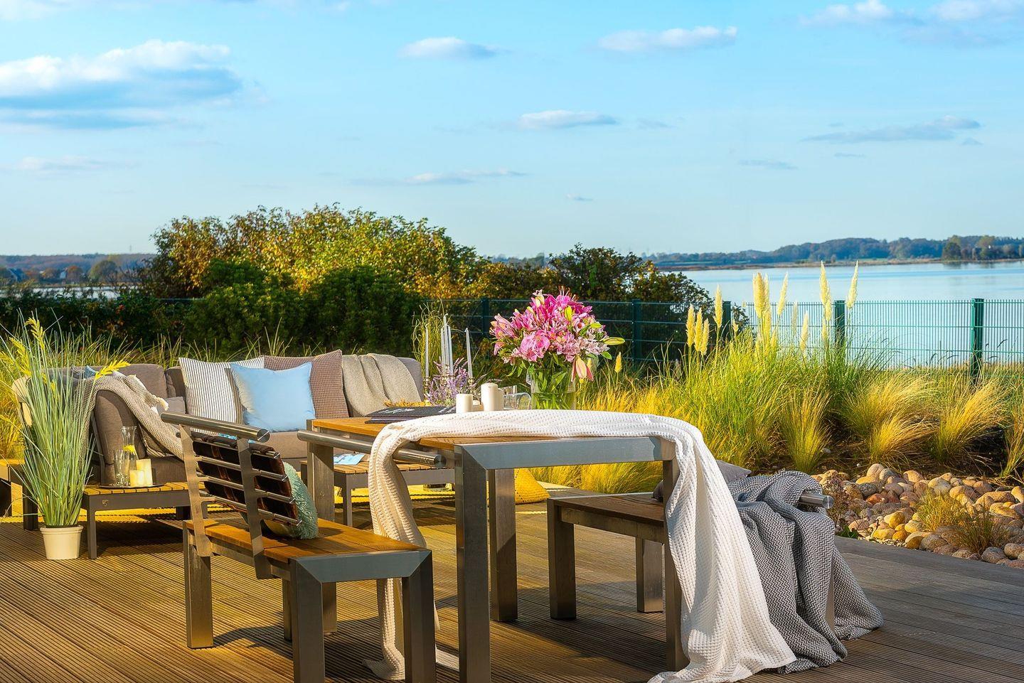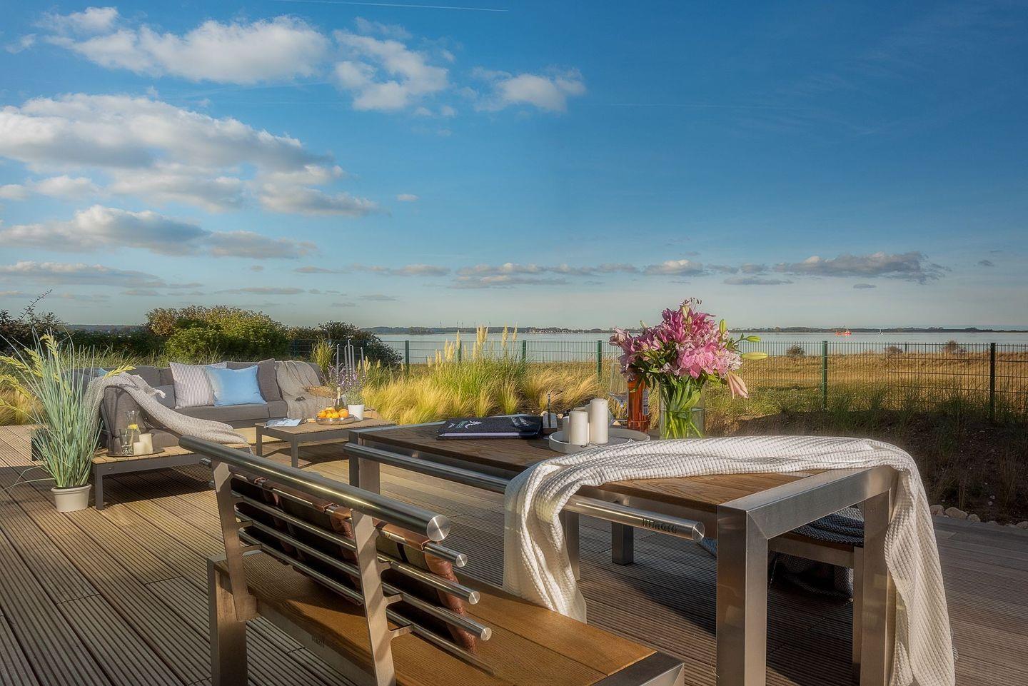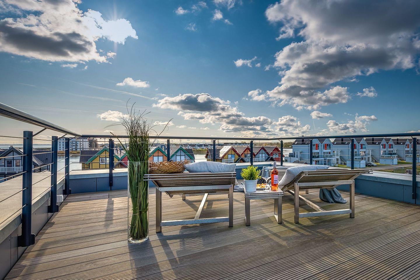 Das Highlight befindet sich auf dem Dach der Villa „Aquarius". Die große Dachterrasse bietet eine spektakuläre Aussicht auf das Meer, die dahingleitenden Segelboote und die unvergleichliche Natur der Ostsee. Hier kann zu jeder Zeit die Sonne genossen werden. Hochwertige Loungemöbel und Designerbestuhlung bieten vor perfekter Kulisse Erholungsgarantie.