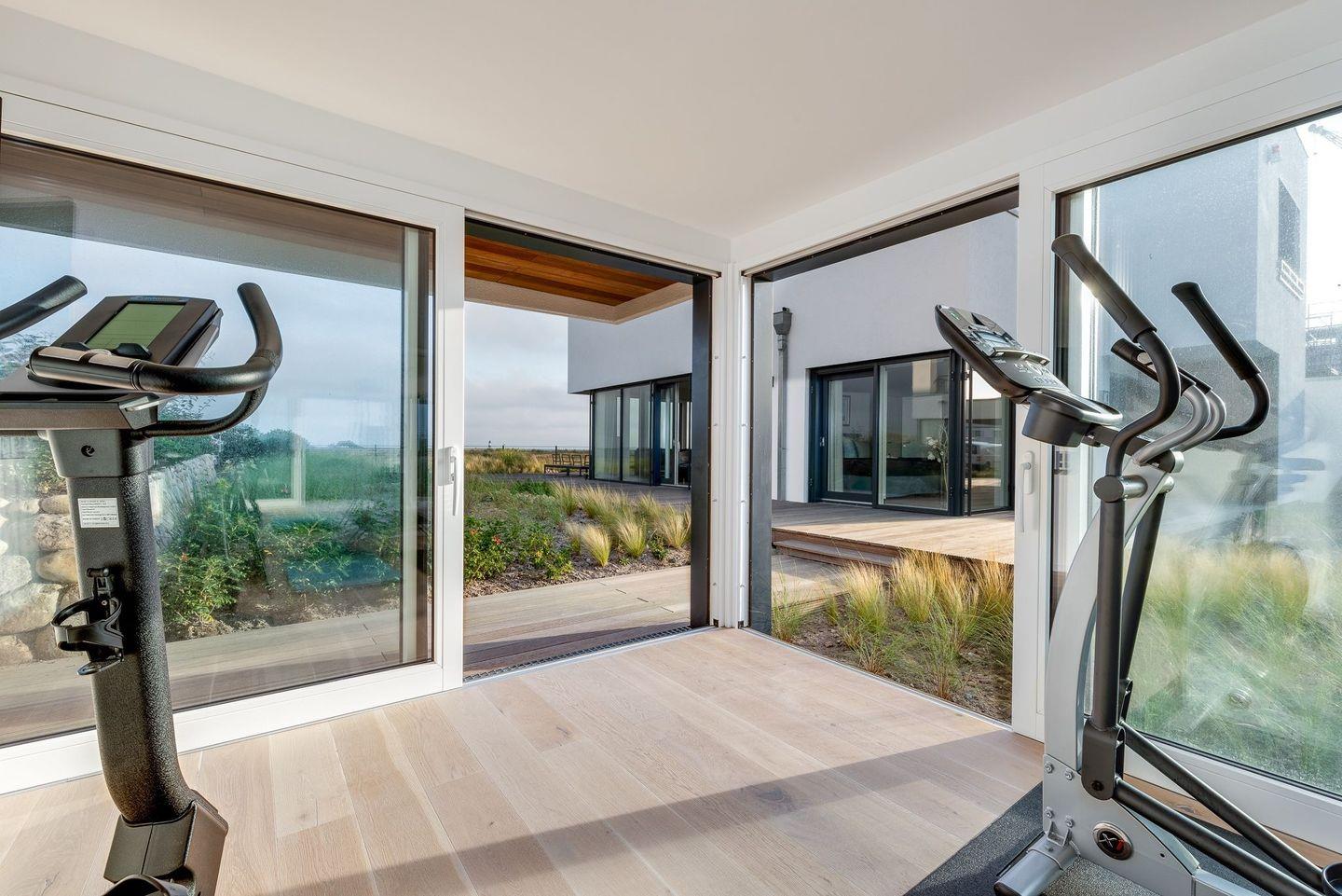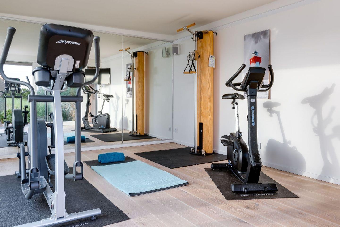 Ein besonderes Highlight ist der große Fitnessbereich, der sich in einem separaten Gebäude befindet und direkt an das Ferienhaus anschließt. Über die umlaufende Terrasse im Erdgeschoss gelangen unsere Gäste direkt in den nicht einsehbaren Fitnessbereich, der neben hochwertigen Geräten die Möglichkeit bietet, das Workout mit Meerblick in privater Atmosphäre zu genießen. Ein Flatscreen-TV befindet sich ebenfalls in diesem Raum.