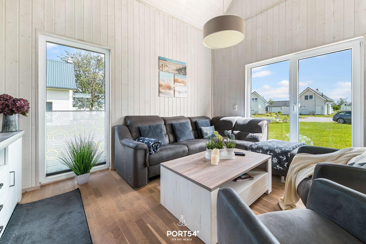 Willkommen in Ihrem Feriendomizil "Sanfte Brise" in Olpenitz. Im Erdgeschoss befindet sich der große, loftartig angelegte Wohn- und Essbereich, zwei Schlafzimmer sowie ein Badezimmer. Ein weiteres Bad und ein Schlafzimmer finden Sie im Obergeschoss. Die hohen Decken und die großen Fenster sorgen für besonders viel Lichteinfall und ein großzügiges Wohngefühl. Das 98m² große, freistehende Haus besticht durch seine Lage im Grünen und der unmittelbaren Nähe zur Ostsee. Nach langen Strandspaziergängen können Sie auf dem gemütlichen Sofa vor dem Kamin entspannen oder Ihre Lieblingsserie über den vorhandenen Blu-ray-Player auf dem Flachbild-TV schauen. Für die Kleinen stehen zwei Kinderreisebetten und zwei Kinderhochstühle bereit. Die voll ausgestattete Küche bietet alles, was Sie für einen geselligen Kochabend mit der Familie benötigen. Ein Schlafzimmer im Erdgeschoss ist mit einem Doppelbett (180x200cm) und einem Flachbild-TV ausgestattet, das andere verfügt über zwei Einzelbetten (je 90x200cm). Im dritten Schlafzimmer im Obergeschoss finden Sie ein Doppelbett (180x200cm), ein zusätzliches Schlafsofa (160x200cm) sowie einen Smart-TV. Für erholsame Nächte sind alle Schlafzimmer mit Verdunkelungsmöglichkeiten und Fliegengittern ausgestattet. Das Badezimmer im Erdgeschoss ist mit einer Badewanne, einem Handtuchheizkörper, einer Waschmaschine und dem Highlight, einer Infrarot-Sauna ausgestattet. Hier können Sie sich an kalten Tagen aufwärmen und entspannen. Das weitere Badezimmer im ersten Obergeschoss bietet eine Dusche, ebenfalls einen Handtuchheizkörper, einen Wäschetrockner und einen Föhn. An sonnigen Tagen können Sie es sich auf der möblierten Terrasse gemütlich machen. Auf den Sonnenliegen können Sie ihre Urlaubstage genießen und an lauen Sommerabenden mit der Familie die Tage auf der Terrasse ausklingen lassen. Das Ferienhaus ist für maximal sechs Erwachsene und zwei Kinder vorgesehen, da die Schlafsofas 160cm breit sind. Ihr vierbeiniger Freund kann gerne mitreisen. Für Ihre PKW stehen zwei Stellplätze vor dem Haus zur Verfügung.