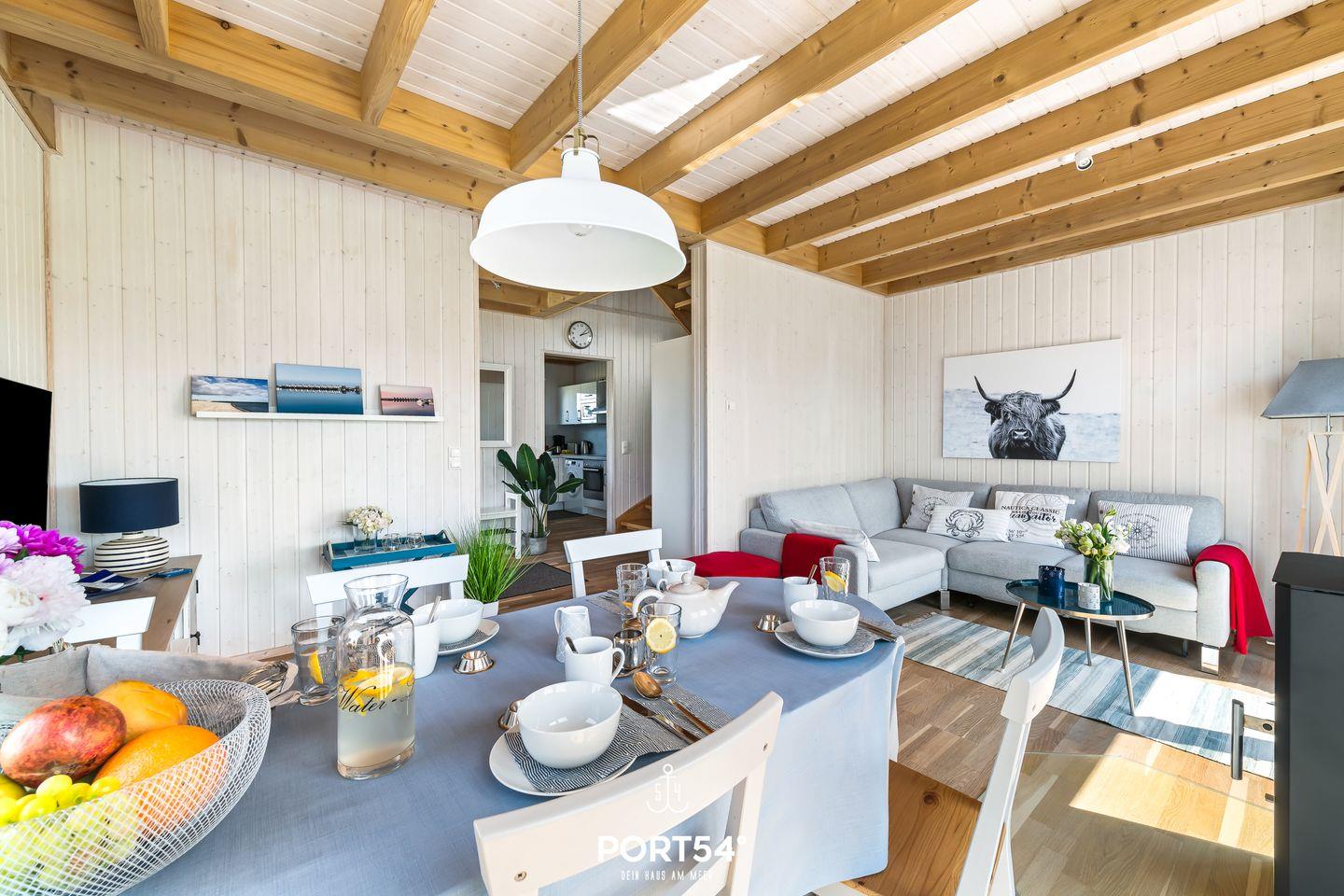 Das Haus verfügt über einen offenen Wohn- und Essbereich, eine Küche, zwei Schlafzimmer und zwei Bäder. Das Schlafsofa ist nur 1.40m breit für 2 Kinder. Die Küche ist voll ausgestattet. Die zwei Schlafzimmer bieten 1 Doppelbett und 2 Einzelbetten. Die Bäder verfügen über 1 Dusche und eine Infrarot-Sauna, sowie 1 Badewanne. Für Ihren PKW ist ein Stellplatz mit E-Ladesäule vor dem Haus. Im abschließbaren Fahrradschuppen können Sie Ihre mitgebrachten oder geliehenen Fahrräder abstellen.