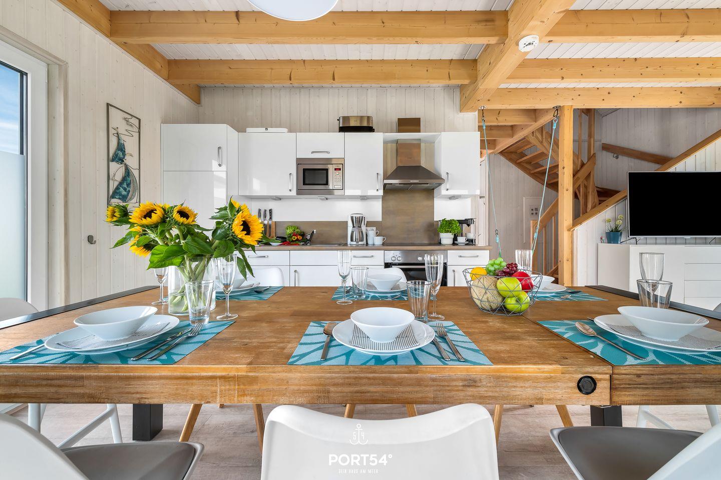 Das Haus verfügt über einen offenen Wohn- und Essbereich, eine Küche, vier Schlafzimmer und zwei Bäder. Die Küche ist voll ausgestattet. Die vier Schlafzimmer bieten jeweils 2 Doppelbetten sowie jeweils 2 Einzelbetten. Eins der beiden Einzelbetten lässt sich zu einem Doppelbett vergrößern, des weiteren steht noch eine Matratze zur Verfügung. Die Bäder verfügen über eine Dusche, eine Badewanne und eine Infrarot-Sauna. Für Ihre PKWs stehen 2 Stellplätze vor dem Haus zur Verfügung.