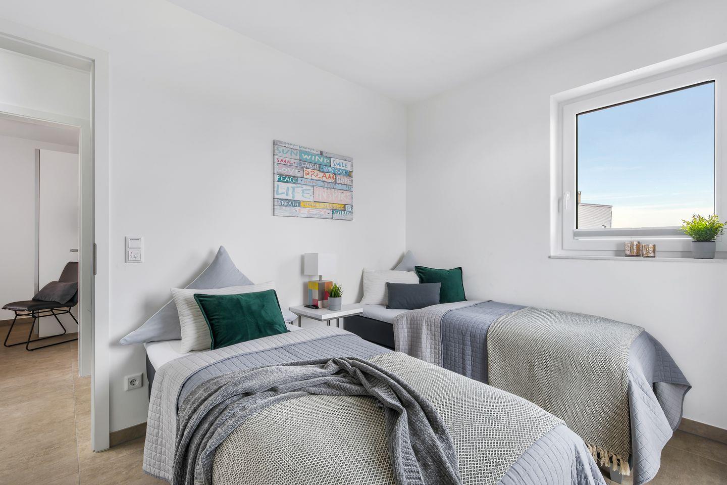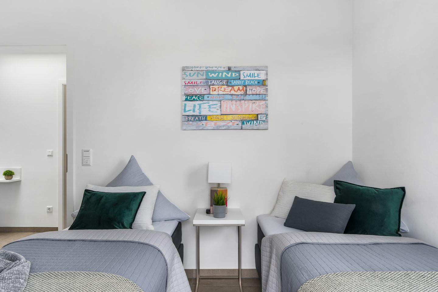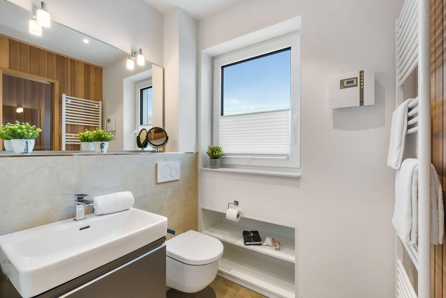 Urlaub mit einer traumhaften Aussicht - das verspricht Ihnen die Penthouse-Ferienwohnung "Dock 76 Bridge". Diese exklusive Penthouse-Ferienwohnung liegt einzigartig auf einem schmalen Landstreifen zwischen der Marina des OstseeResort Olpenitz und der Ostsee. Umgeben von Wasser ermöglicht die im 2.Obergeschoss gelegene Penthouse-Wohnung einen unvergesslichen Blick über den Hafen, den Privatstrand des Resorts und die weite Ostsee. Genießen Sie beim Frühstück auf der 26m² großen Dachterrasse den traumhaften Weitblick, entspannen Sie auf den bequemen Sonnenliegen oder verbringen Sie unvergessliche Grillabende! Durch einen Windschutz können Sie auch bei einer leichten Briese die Dachterrasse hervorragend nutzen. Der Wohn- und Essbereich ist dank der bodentiefen Fensterfront lichtdurchflutet und ermöglich auch vom Sofa aus diesen wunderschönen Ausblick. Verbringen Sie gemütliche Abende auf dem Sofa und schauen Sie auf dem Flachbild-Fernseher einen Film über den Blu-ray-Player. Die vollausgestattete Küche lässt keine Wünsche offen. Hier finden Sie alles, was Sie zum Kochen und Genießen benötigen, einschließlich einer Geschirrspülmaschine, einen Backofen, Ceranfeld, Mikrowelle, Toaster, Kaffee- und Nespressomaschine, eines Kühlschranks mit Gefrierfach und allen notwendigen Küchenutensilien. Das Tageslicht-Duschbad ist mit einer ebenerdigen Dusche, Kosmetikspiegel, Fön und einer großen finnischen Sauna ausgestattet. Verbringen Sie hier an kühleren Tagen entspannende Wellnessmomente und lassen Sie den Alltagsstress hinter sich. Das eine Schlafzimmer bietet Ihnen ein Boxspring-Doppelbett (160x200cm) - wachen Sie hier mit einem Blick auf den Strand auf. Das andere Schlafzimmer ist mit zwei Boxspring-Einzelbetten (je 80x200cm) ausgestattet. Beide Schlafzimmer verfügen über einen Kleiderschrank, einen Flachbild-Fernseher und Verdunkelungsmöglichkeiten für einen erholsamen Schlaf. Am Haus steht Ihnen einen PKW-Stellplatz mit einer Ladesäule für Ihr Elektroauto zur Verfügung. Der private Sandstrand des Resorts ist nur wenige Meter von der Ferienwohnung entfernt. Genießen Sie hier einen unvergesslichen Ostseeurlaub!