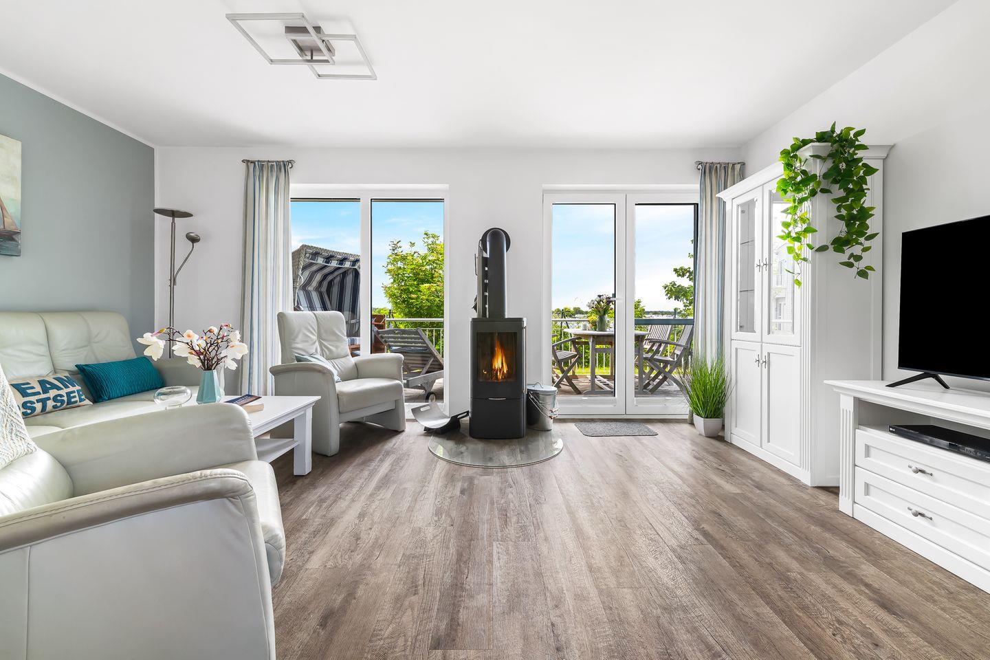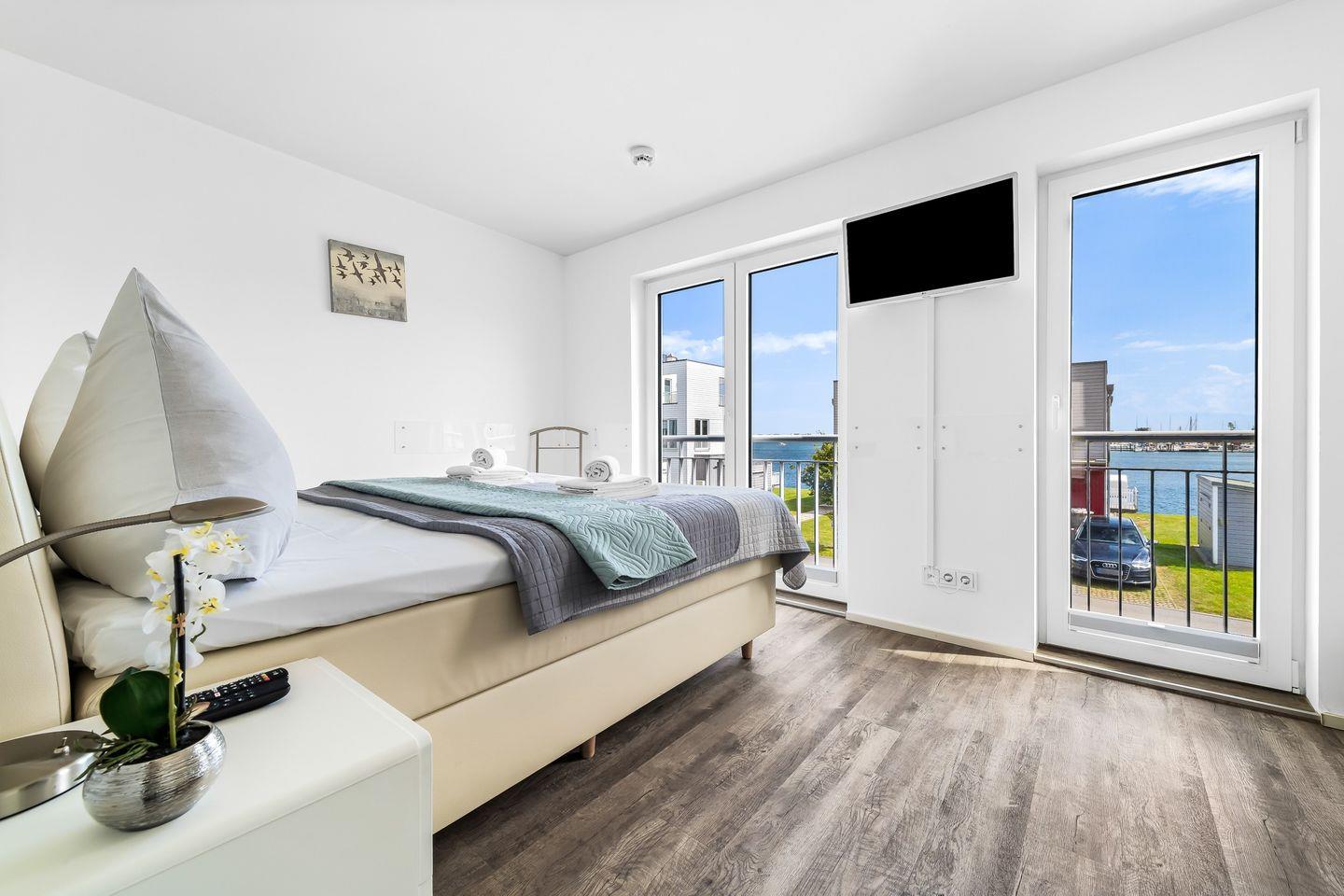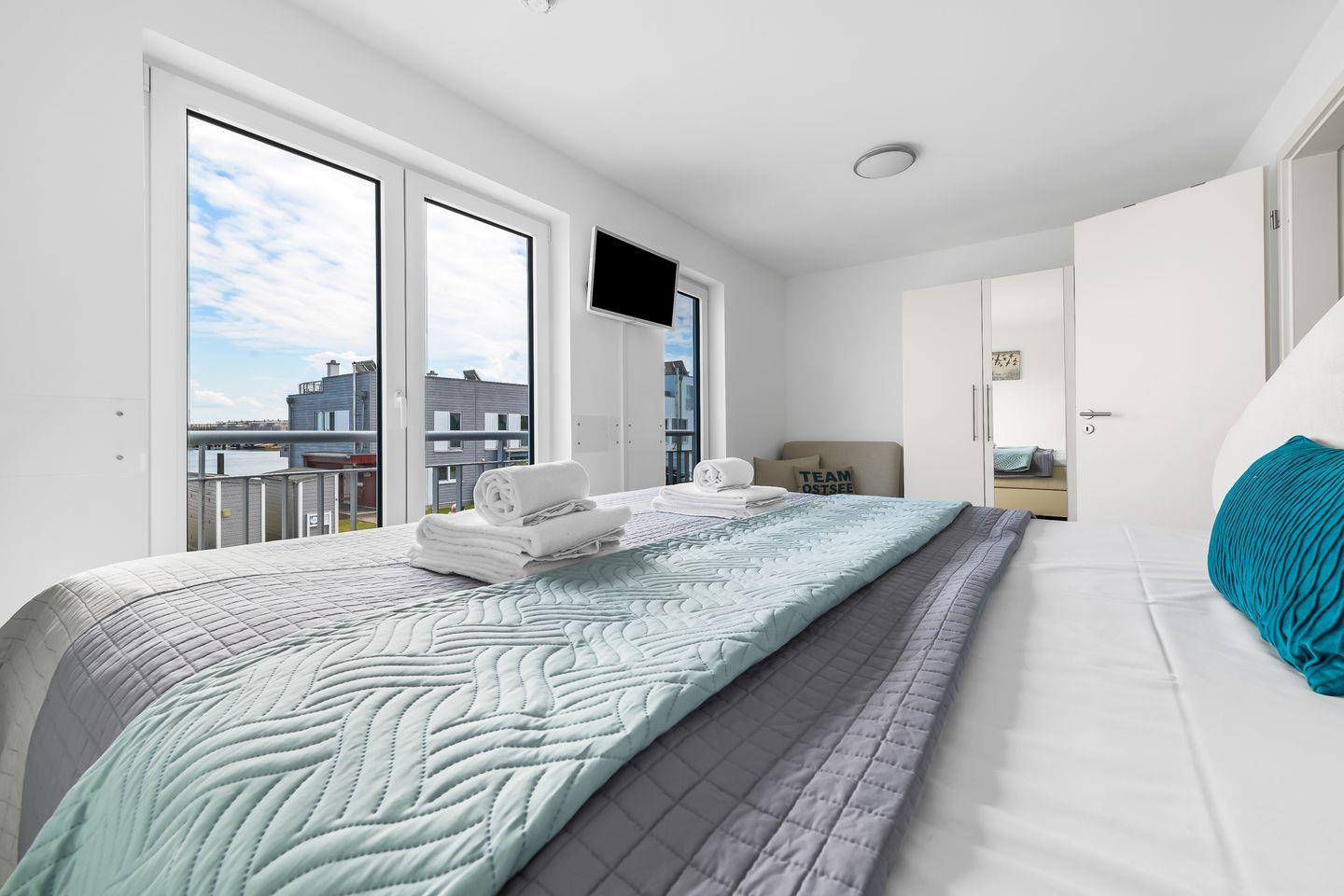 Diese traumhafte Doppelhaushälfte bietet auf knapp 102m² allen Luxus, den man sich für einen erholsamen Urlaub wünschen kann! Nach Betreten dieser befinden Sie sich im lichtdurchfluteten Wohn- und Essbereich wieder, der modern und gemütlich eingerichtet ist. Dank der bodentiefen Panoramafenster haben Sie einen atemberaubenden Ausblick über die Schlei. Vom Wohn- und Essbereich aus haben Sie Zugang zu der Terrasse. Genießen Sie Ihr Frühstück auf den Gartenmöbeln oder beobachten Sie den Sonnenuntergang mit einem Glas Wein im Strandkorb. Für gesellige Grillabende steht Ihnen ein Elektro-Grill zu Verfügung. Auch der Kaminofen im Wohnbereich trägt zu einer Wohlfühlatmosphäre an kühleren Tagen bei. Verbringen Sie gemütliche TV-Abende auf dem Sofa oder gemeinsame Spielabende mit den hauseigenen Spielen am Esstisch. Die offene Küche ist hervorragend ausgestattet und ermöglicht Ihnen vielfältige Möglichkeiten Ihre Speisen zu zubereiten. Im Obergeschoss befinden sich die beiden Schlafzimmer. Das eine ist mit einem gemütlichen Boxspring-Doppelbett ausgestattet und bietet einen traumhaften Blick auf die Schlei. Das andere Schlafzimmer verfügt ebenfalls über ein Boxspringbett-Doppelbett (180x200cm) und bietet einen weiteren Schlafplatz auf einem Schlafsessel (100x200cm). In diesem Schlafzimmer befindet sich zusätzlich ein Flachbild-Fernseher und Sie haben von hier aus einen wunderbaren Blick auf die Marina des Resorts. Beide Schlafzimmer bieten Ihnen jeweils einen Kleiderschrank und Verdunkelungsmöglichkeiten. Das große Wellnessbad mit eigener finnischer Sauna ist ein absolutes Highlight! Entspannen Sie hier wahlweise in der Whirlwanne oder unter der Dusche. Ein weiteres Highlight des Hauses ist die große Dachterrasse mit 360° Panoramablick. Bestaunen Sie ein unvergesslicher Ausblick auf die Schlei, die Schleimündung, die Ostsee und das Hafenbecken des OstseeResorts Olpenitz. Zwei eigene PKW-Stellplätze und ein abschließbarer Fahrradschuppen sind am Haus vorhanden.