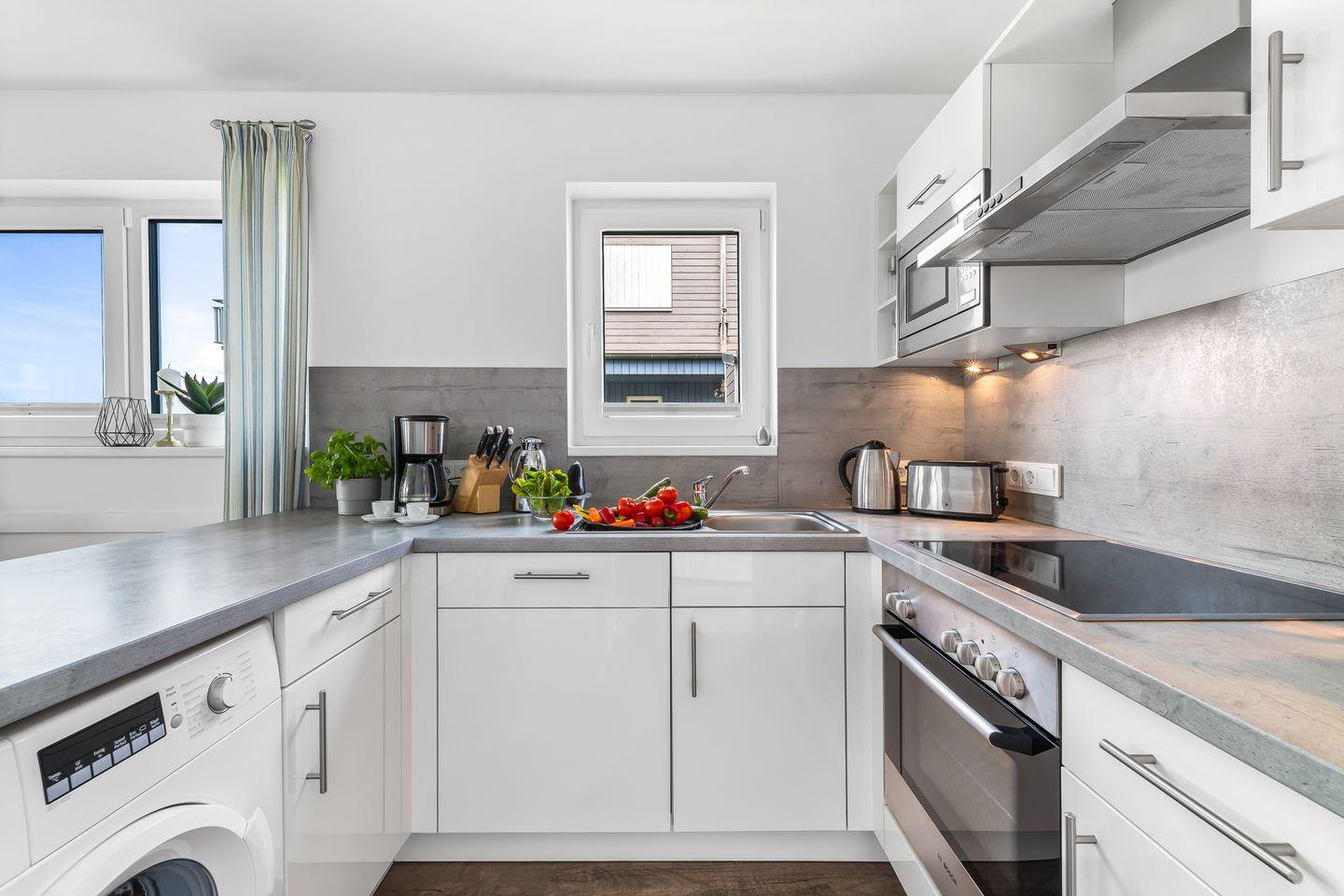 Nach Betreten befinden Sie sich im Wohn- und Essbereich mit Kamin. Die Küche ist voll ausgestattet. Im OG sind die beiden Schlafzimmer. Highlights sind das Wellnessbad mit finnischer Sauna und die Dachterrasse, von der Sie einen tollen 360° Wasserblick haben. Stellplätze für 2 PKW und ein Fahrradschuppen sind vorhanden.