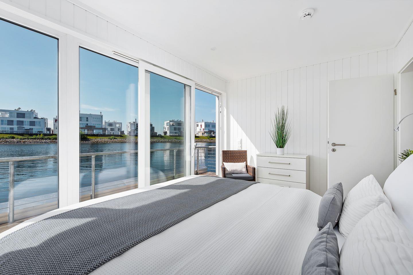 Das schwimmende Haus "Blau im Meer" bietet auf 97m² zwei Schlafzimmer, einen offenen Wohn-/Essbereich, ein Badezimmer, eine Terrasse und eine traumhafte Dachterrasse mit Rundum-Wasserblick! Im Wohnzimmer können Sie es sich auf dem Sofa gemütlich machen und in der vollausgestatteten Küche kann nach Lust & Laune gekocht werden. Das eine Schlafzimmer bietet ein Doppelbett und das andere zwei Einzelbetten. Das Bad verfügt über eine ebenerdige Dusche und es gibt eine Finnische Sauna im Haus.