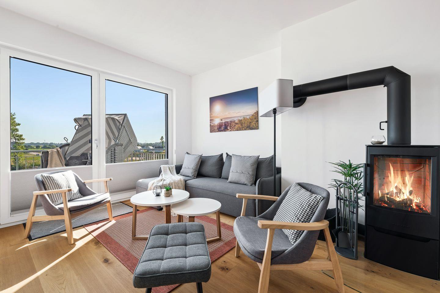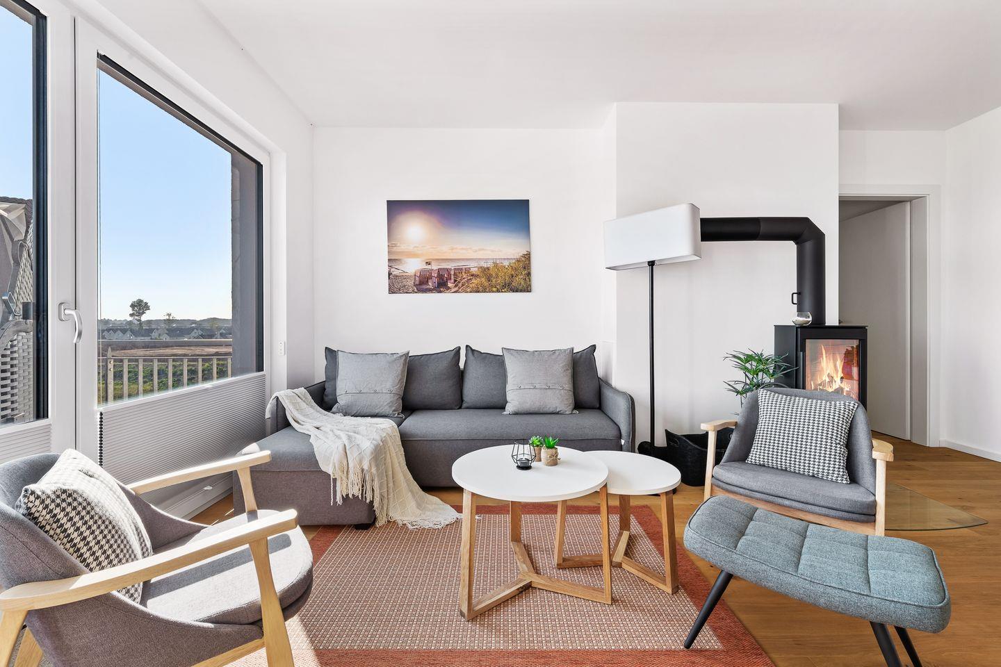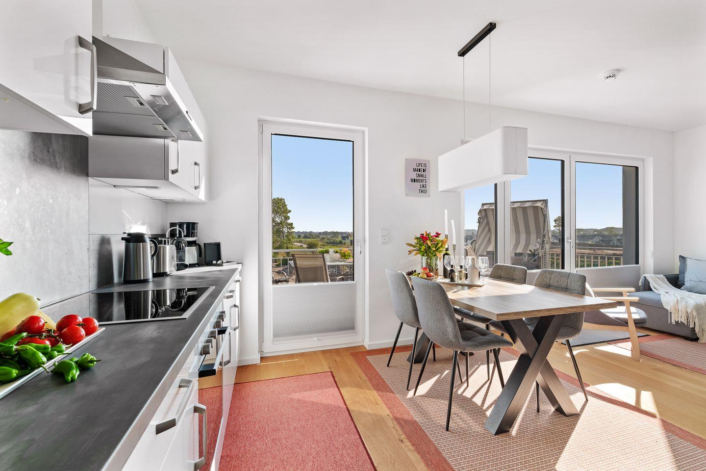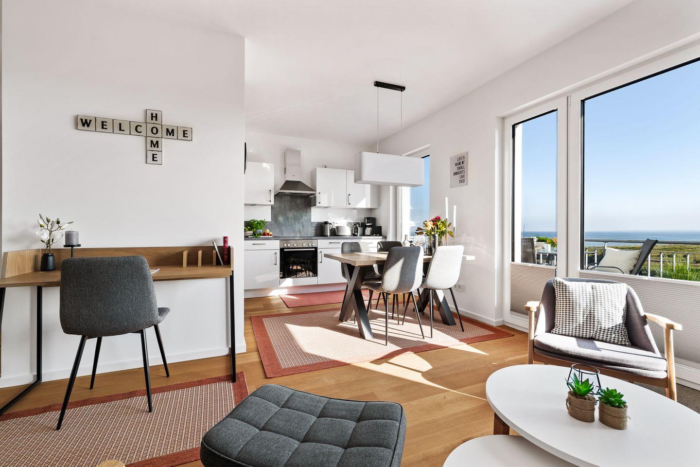 Die Ferienwohnung "Ostseerauschen" bietet auf 78m² die perfekte Kulisse für einen erholsamen Urlaub an der Ostsee. Schon beim Betreten der Wohnung spürt man die entspannte Atmosphäre, die durch die geschmackvolle Einrichtung entsteht. Der großzügige Balkon mit traumhaftem Blick auf die Ostsee und den Weidefelder Strand lädt dazu ein, den Alltag hinter sich zu lassen. Hier können Sie gemütlich in den Gartenmöbeln Platz nehmen, die frische Meeresluft einatmen und bei einem Buch abschalten. Ein Sonnenschirm bietet Schatten und mit dem Elektrogrill können Sie direkt auf dem Balkon frische Meeresfrüchte oder andere Köstlichkeiten zubereiten, während die Wellen im Hintergrund sanft rauschen. Im Inneren der Wohnung finden Sie im Wohn- und Essbereich alles, was Sie für entspannte Stunden brauchen. Der Kaminofen sorgt an kühleren Tagen für wohlige Wärme, während Sie auf dem bequemen Sofa bei einem guten Film vorm Flachbild-TV die Seele baumeln lassen. Ein Schreibtisch steht bereit, falls Sie doch einmal den Drang verspüren sollten, ein wenig zu arbeiten oder einfach nur ein paar Postkarten zu schreiben. Die offene, voll ausgestattete Küche bietet Ihnen die Möglichkeit Ihre Lieblingsgerichte zuzubereiten und dabei den Ausblick auf die Ostsee zu genießen. Die beiden Schlafzimmer sind wahre Ruheoasen, jedes mit einem hochwertigen Boxspring-Doppelbett (180x200cm) ausgestattet, das für einen erholsamen Schlaf sorgt. Beide Schlafzimmer bieten in den Kleiderschränken viel Stauraum für Ihre Garderobe. Die sanfte Meeresbrise, die durch das Fenster weht, begleitet Sie in den Schlaf, während die Verdunklungsmöglichkeiten für Nachtruhe sorgen. Das Badezimmer bietet mit seiner ebenerdigen Dusche und dem Tageslicht die perfekte Möglichkeit, nach einem Strandtag abzuschalten. Ein kleiner Kosmetikspiegel, ein Fön und ein Handtuchheizkörper tragen zum Komfort bei. Auch an die kleinen Gäste wurde mit einem Kindertritt-Hocker gedacht. Ein weiterer Komfortfaktor ist die Fußbodenheizung, die in der gesamten Wohnung für eine gleichmäßige Wärme sorgt. Zudem steht eine Waschmaschine zur Verfügung, sodass Sie sich auch bei längeren Aufenthalten um nichts sorgen müssen. Die Nähe zum Weidefelder Strand macht diese Wohnung zum idealen Rückzugsort für alle, die sich nach Ruhe, Natur und dem wohltuenden Klang der Ostseewellen sehnen. Hier können Sie den Alltag hinter sich lassen und einfach nur die Erholung genießen, die diese wunderschöne Umgebung bietet. Das Apartmentgebäude ist mit einem Aufzug ausgestattet, der Ihnen einen bequemen Zugang zu Ihrem Refugium ermöglicht. Ihren PKW können Sie auf dem zur Ferienwohnung gehörenden Parkplatz in der Tiefgarage (Einfahrt 2m hoch) parken. Für Ihre Fahrräder steht ein gemeinschaftlicher abschließbarer Fahrradkeller zur Verfügung.
