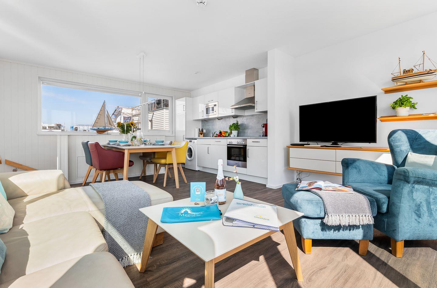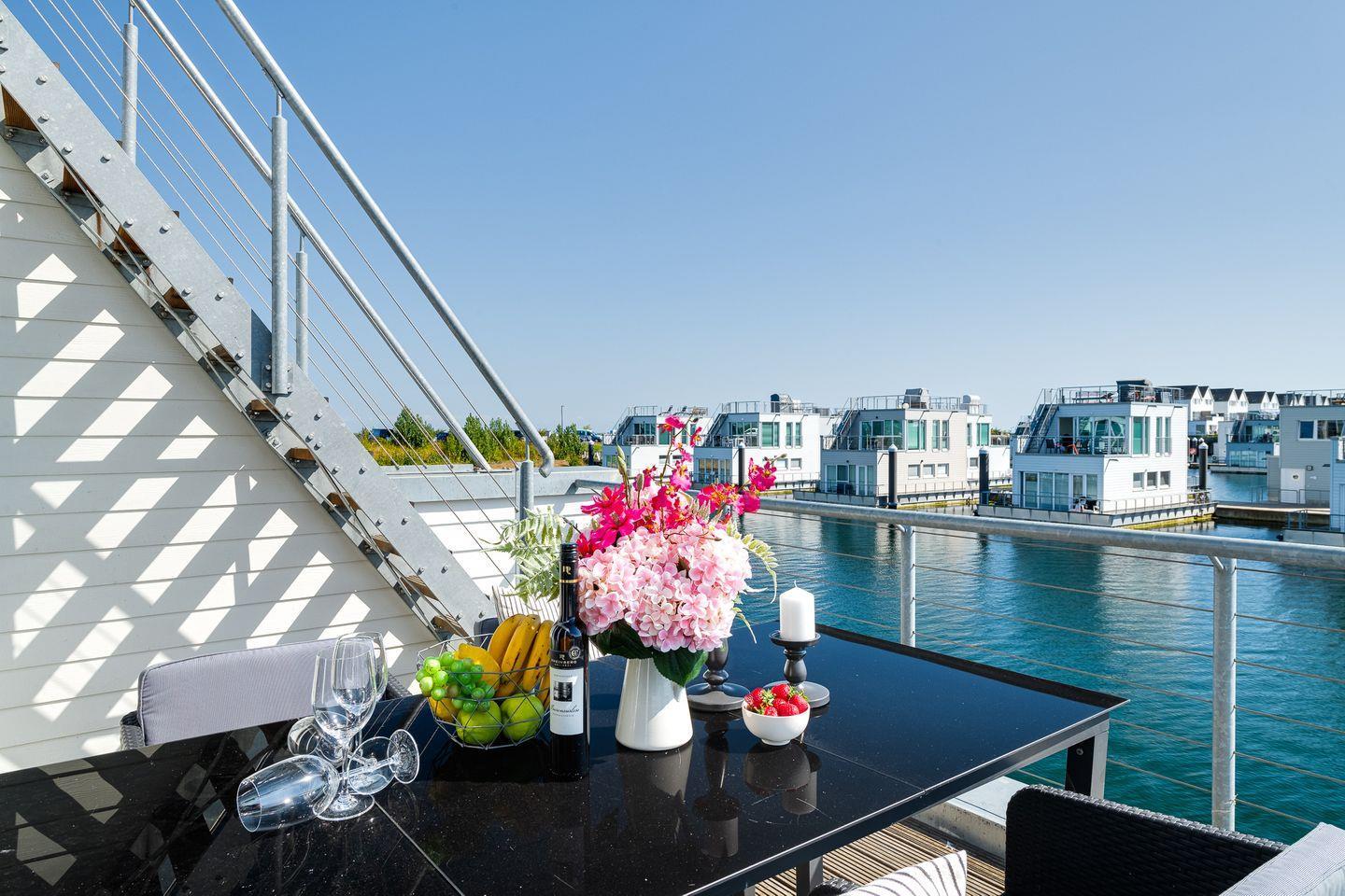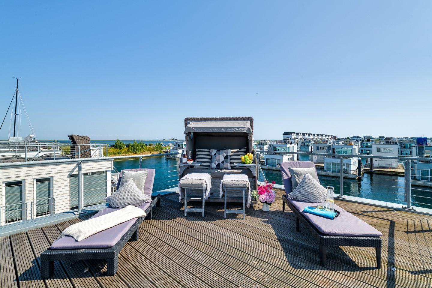 Der offen gestaltete Wohn- und Essbereich im ersten Obergeschoss beeindruckt mit großzügigen Fensterfronten, die einen spektakulären Wasserblick freigeben. Die Holzterrasse mit Südwestausrichtung ist ideal für entspannte Sommerabende und führt zu einer 30 m² großen Dachterrasse, wo Sie die Sonne den ganzen Tag über genießen und einen weiten Blick über den Hafen des Ostsee Resort Olpenitz sowie die Schlei und Ostsee haben.