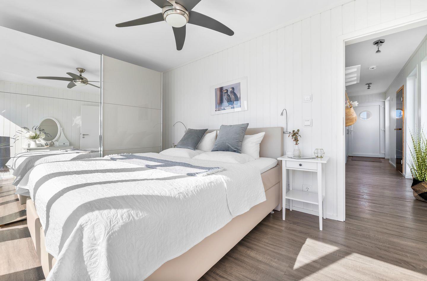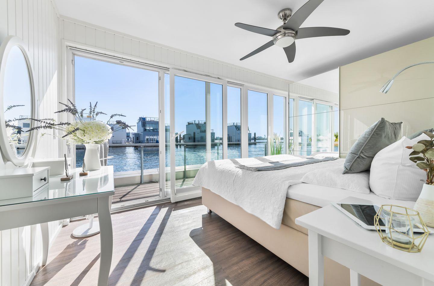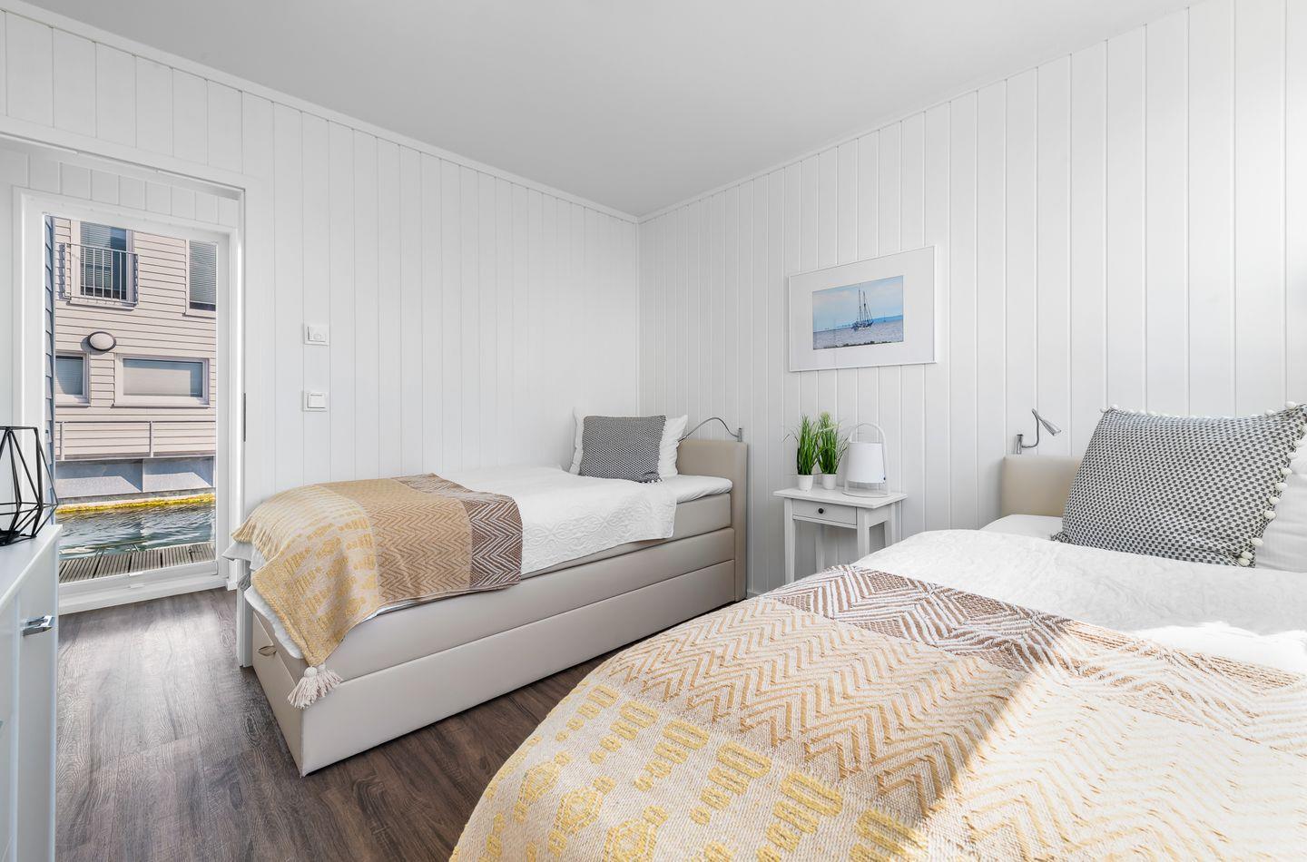Entspannen Sie sich in der finnischen Sauna und profitieren Sie von der angenehmen Fußbodenheizung, die sich durch das gesamte Wasserhaus zieht. Im Erdgeschoss befindet sich der Schlafbereich mit einem Masterbedroom, der über ein Doppelbett und bodentiefe Panoramafenster verfügt, die direkten Zugang zur umlaufenden Terrasse bieten. Ein weiteres Schlafzimmer, mit zwei 90x200 Betten, befindet sich ebenfalls im Erdgeschoss.