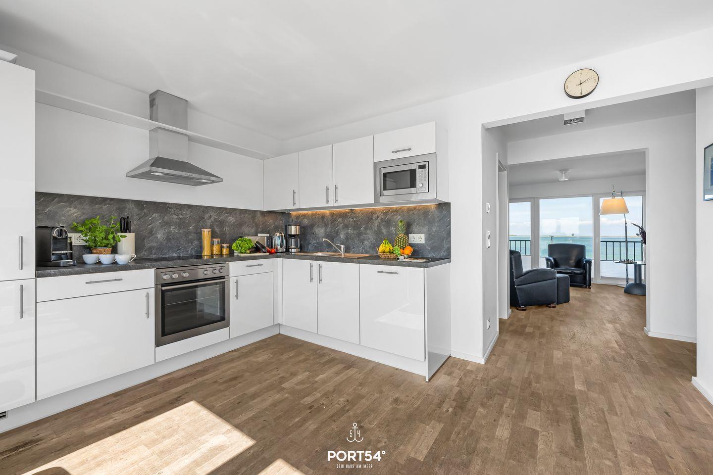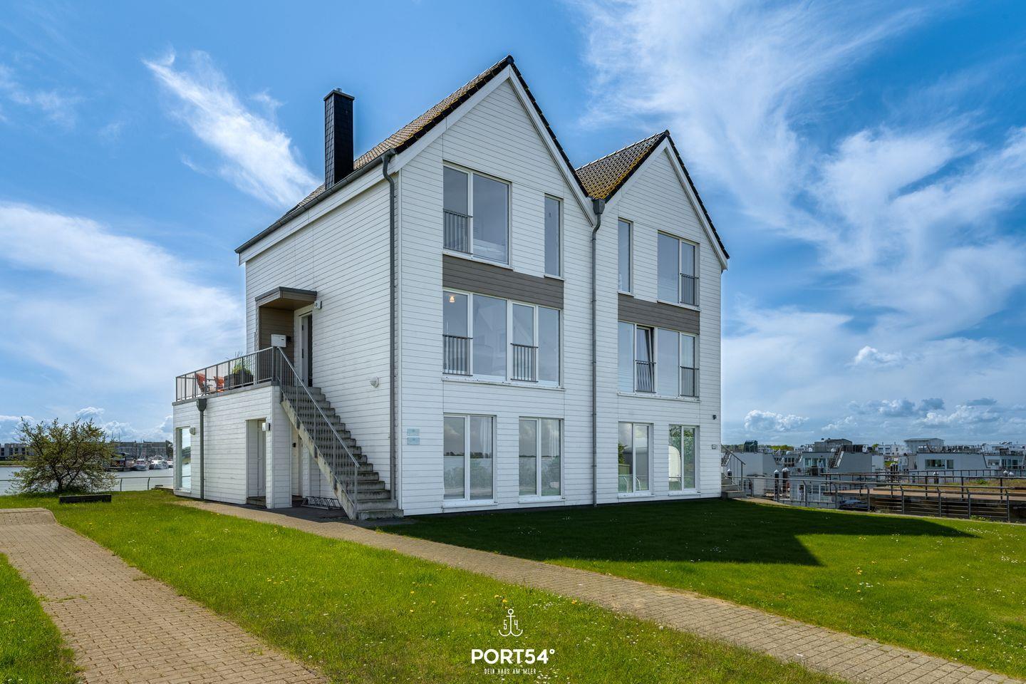Die Ferienwohnung "Durchblick" bietet auf 97m² Platz für bis zu fünf Personen und liegt in erster Reihe am Wasser. Im ersten Obergeschoss befinden sich eine voll ausgestattete Küche mit Essbereich, ein Balkon mit Hafenblick, ein Duschbad sowie der Wohnbereich mit TV und Kaminofen. Eine Treppe führt in die zwei Schlafzimmer im zweiten Obergeschoss. Highlight ist das Wellnessbad mit Whirlpool und Infrarotkabine. Ein Schlafsofa und ein kostenloser PKW-Stellplatz ergänzen das Angebot.