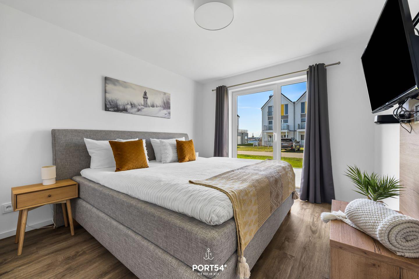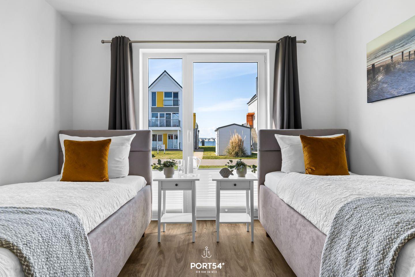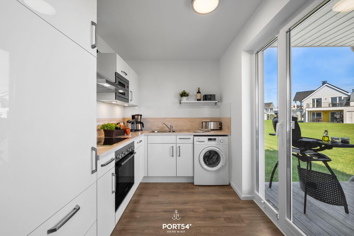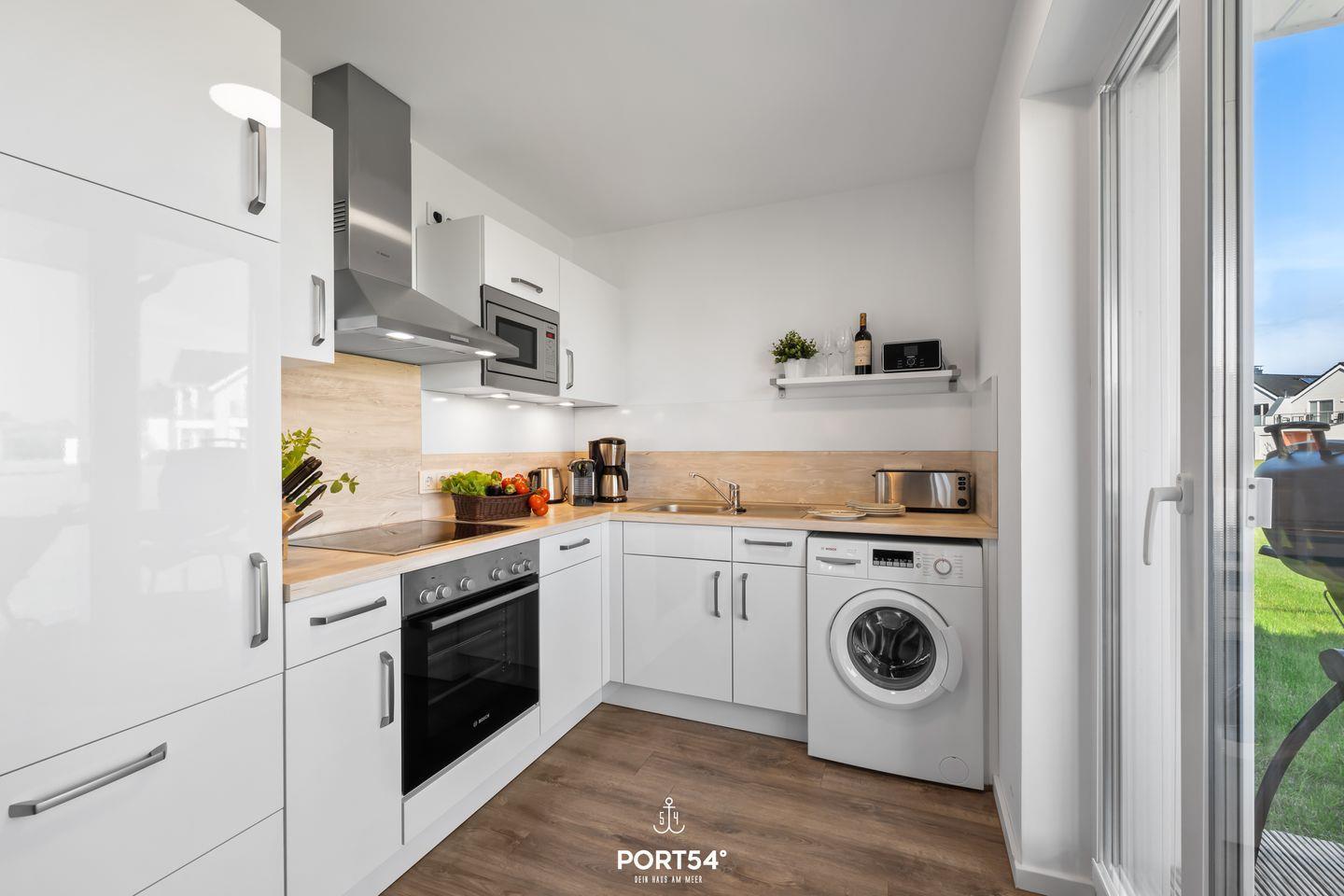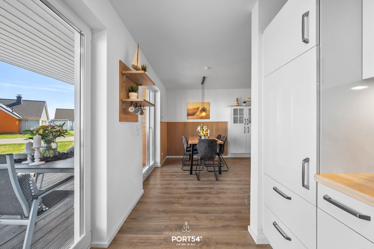 Stilvoll, strandnah und gemütlich - genießen Sie Ihren Ostseeurlaub in der Ferienwohnung "Nordisch 54" im OstseeResort Olpenitz. Die große Wohnung befindet sich im Erdgeschoss und bietet 5 Personen ausreichend Platz. Im Wohn- und Essbereich können Sie es sich auf dem Sofa gemütlich machen. Lassen Sie sich von einem spannenden Film auf dem Flachbild-Fernseher unterhalten. An kühleren Tagen spendet der Kaminofen eine wohlige Wärme. Die angrenzende offene Küche ist voll ausgestattet, so dass Ihnen währen Ihres Aufenthalts an nichts fehlen wird, um leckere Gerichte zuzubereiten. Von der Küche und dem Essbereich aus gelangen Sie auf die überdachte Terrasse. Frühstücken Sie hier an der frischen Meeresluft, oder verbringen Sie unvergessliche Grillabende am Elektro-Grill. Auf den Sonnenliegen können Sie hervorragend entspannen. Das Tageslichtbad ist Ihr privater Wellness-Bereich. In der Infrarot-Sauna können Sie sich wunderbar vom Alltagsstress erholen und sich anschließend in der ebenerdigen Dusche erfrischen. Auch ein Handtuchheizkörper, ein Kosmetikspiegel und ein Föhn sind im Bad vorhanden. Die beiden Schlafzimmer bieten Ihnen ein bequemes Doppelbett (200x210cm) und zwei gemütliche Einzelbetten (90x200cm). Beide Schlafzimmer sind mit einem Kleiderschrank, Verdunkelungsmöglichkeiten und einem Flachbild-Fernseher ausgestattet. Für unsere kleinen Gäste sind in der Wohnung ein Kinderreisebett, ein Hochstuhl und ein Kindertritthocker vorhanden. Vor der Ferienwohnung steht Ihnen ein kostenloser PKW-Stellplatz und ein abschließbarer Fahrradschuppen zur Verfügung.