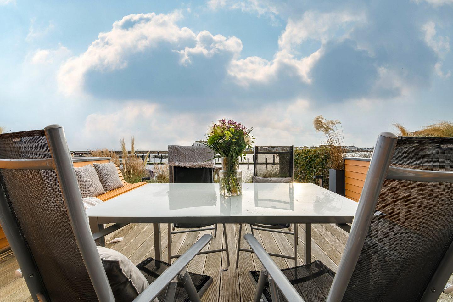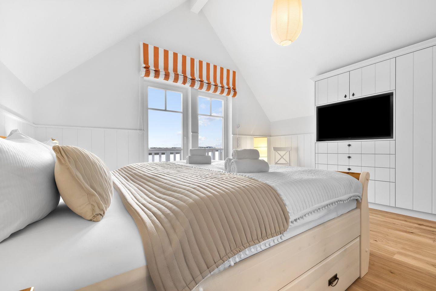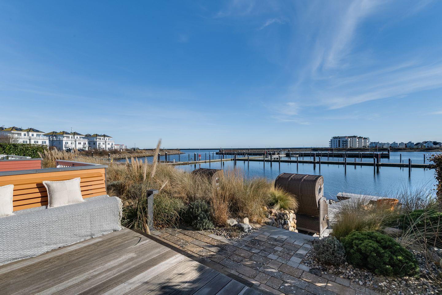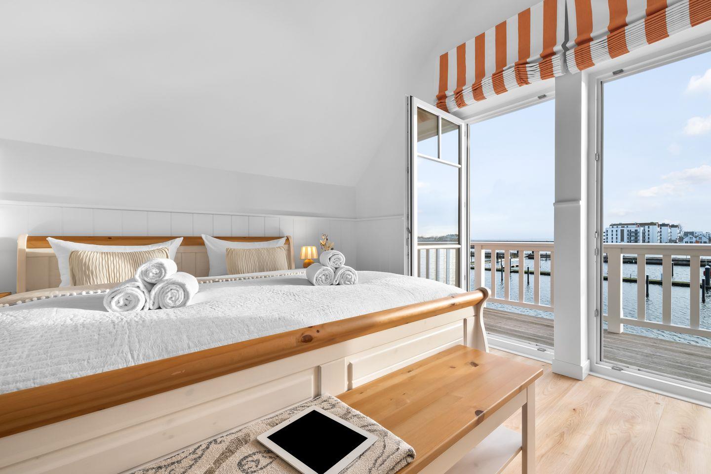 Im Obergeschoss erwarten Sie zwei Schlafzimmer mit komfortablen Doppelbetten, Flatscreen und geräumigen Kleiderschränken. Das Badezimmer bietet eine bodengleiche Dusche und eine finnische Sauna. Das Schlafzimmer mit Balkon lädt dazu ein, die ersten Sonnenstrahlen und den Panoramablick über den Hafen zu genießen.