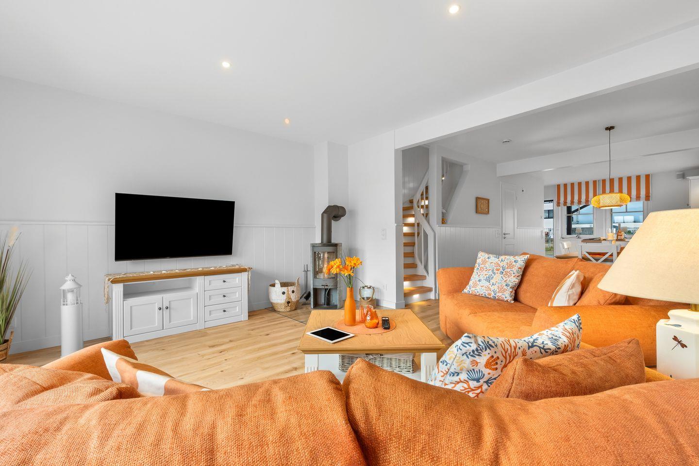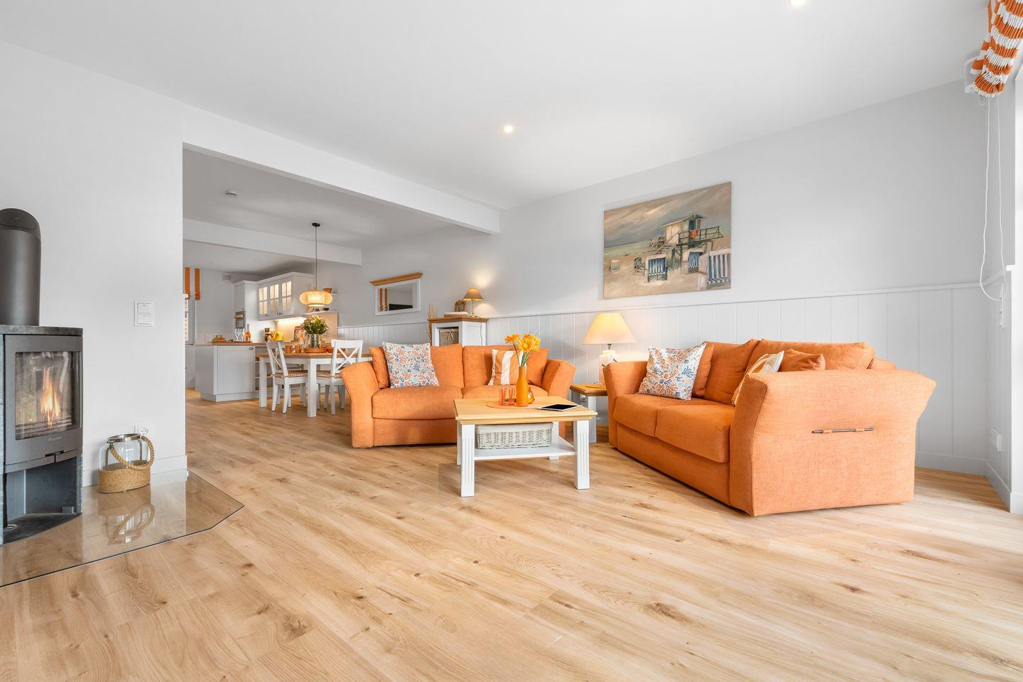 Der lichtdurchflutete Wohn- und Essbereich mit bodentiefen Panoramafenstern bietet einen herrlichen Blick auf den Segel- und Sportboothafen des Ostseeresorts Olpenitz. Entspannen Sie auf den bequemen Sofas oder genießen Sie den Abend vor dem knisternden Kaminfeuer. Die moderne Küche ist bestens ausgestattet und lässt keine Wünsche offen.
