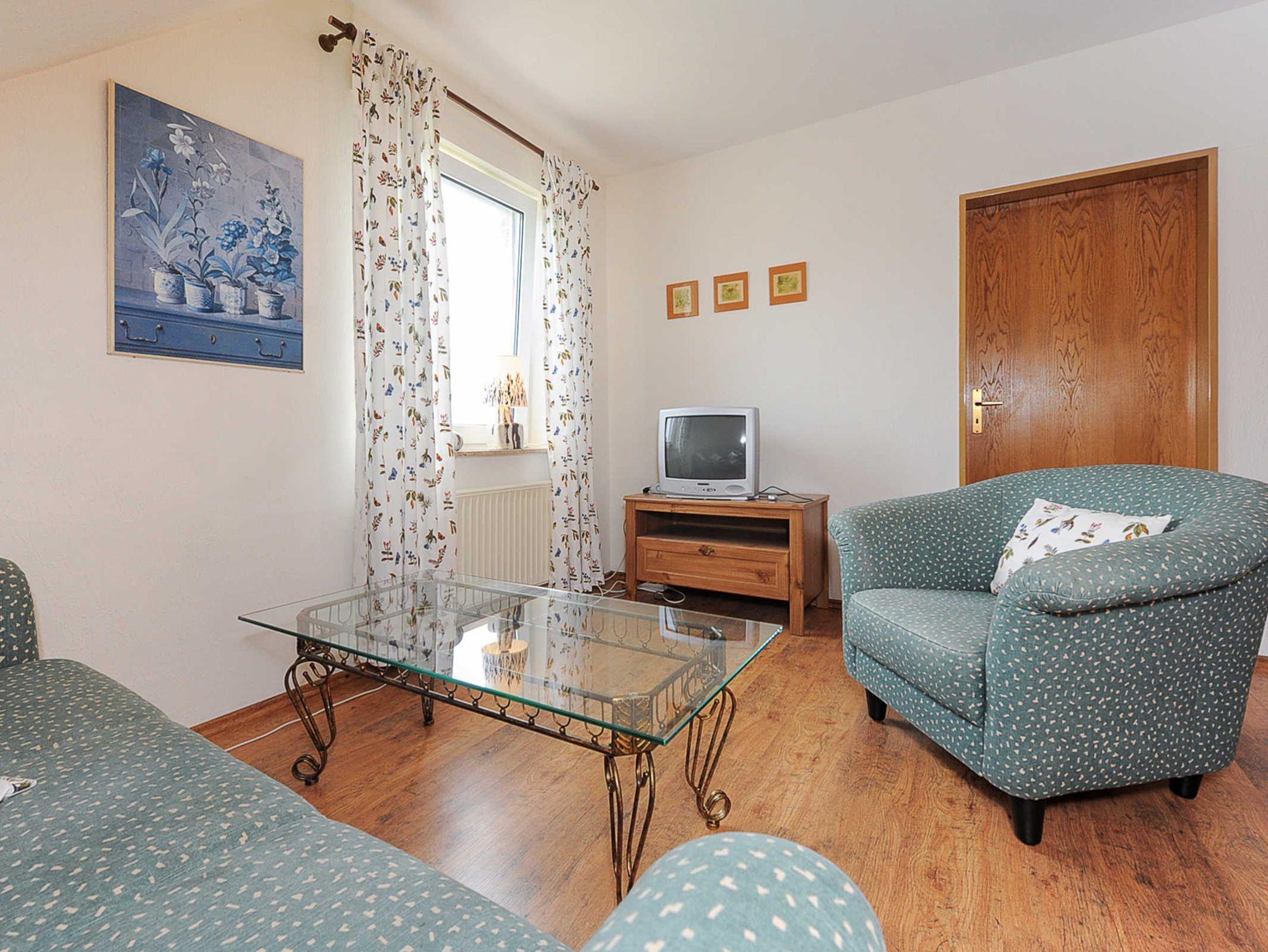 Größe ca. 40 Quadratmeter, Wohnzimmer, Küche, Schlafzimmer, Badezimmer mit Dusche, Waschtisch und WC, Obergeschoss, optimal für 2 Personen.
