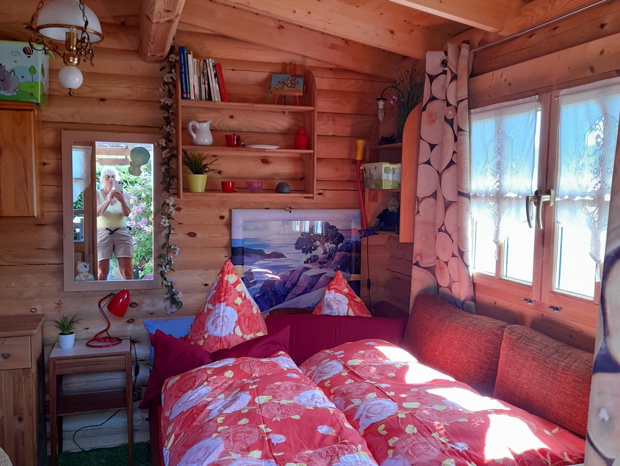 Ferienhaus für 4 Personen mit separatem Schlafhäuschen (9 m²) auf dem 250 m² großen Grundstück. Erster Wohnraum: große Couch, HD-SAT-TV, Stereoanlage mit CD, div. Mobiliar. Zweiter Wohnraum: ist durch viele Fenster und Ausgangstür wintergartenähnlich großzügig gestaltet und bietet durch die räumliche Trennung sowohl einen zusätzlichen Schlafraum für 2 Personen. Beinhaltet Schlafsofa, mit großem Esstisch , Apothekerschrank (div. Tischdecken bzw. Platzdeckchen vorhanden) und gemütliche Sitzecke mit „Oma“- Korbsessel. Beide Wohnräume sind durch eine große Doppeltür miteinander verbunden. Beim Essen haben Sie den Blick zum See, bzw. in den warmen Jahreszeiten auch von der Terrasse aus.