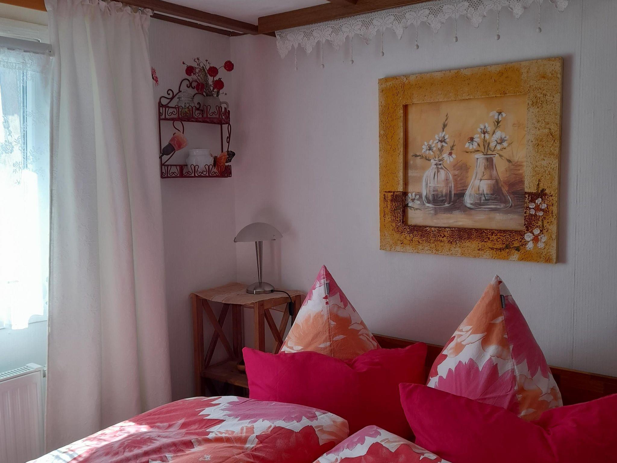 Schlafzimmer: mit Bett (140 x 200), 2 Bettregalen + Nachttischlampen, Spiegel, großer Einbauschrank mit Schiebetüren (2,50 x 67), mit Blick zu See. Die Betten sind bei Anreise für 2 Personen bezogen, nur noch hineinspringen. Ein Kinderreisebett ist bei Bedarf vorhanden.