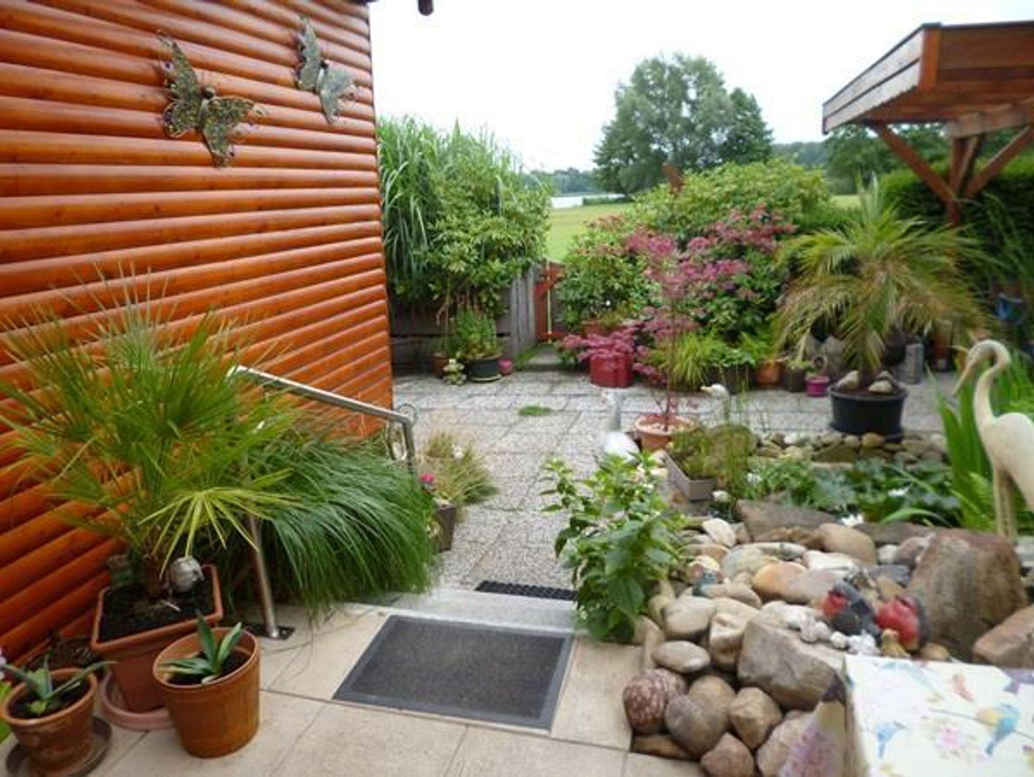 Im Eingangsbereich zum FH empfängt Sie gleich ein Kräutergarten, dessen Kräuter mitbenutzt werden können. Wenn Sie entspannt auf der überdachten Terrasse sitzen, gucken Sie auf einen kleinen Wasserlauf, der in den kleinen angrenzenden Teich führt und können den freien Blick über das Gartentörchen, über die Wiese zum See genießen. Auch der Freisitz ist nicht nur urig, sondern auch überdacht und vor Blicken von außen geschützt.
