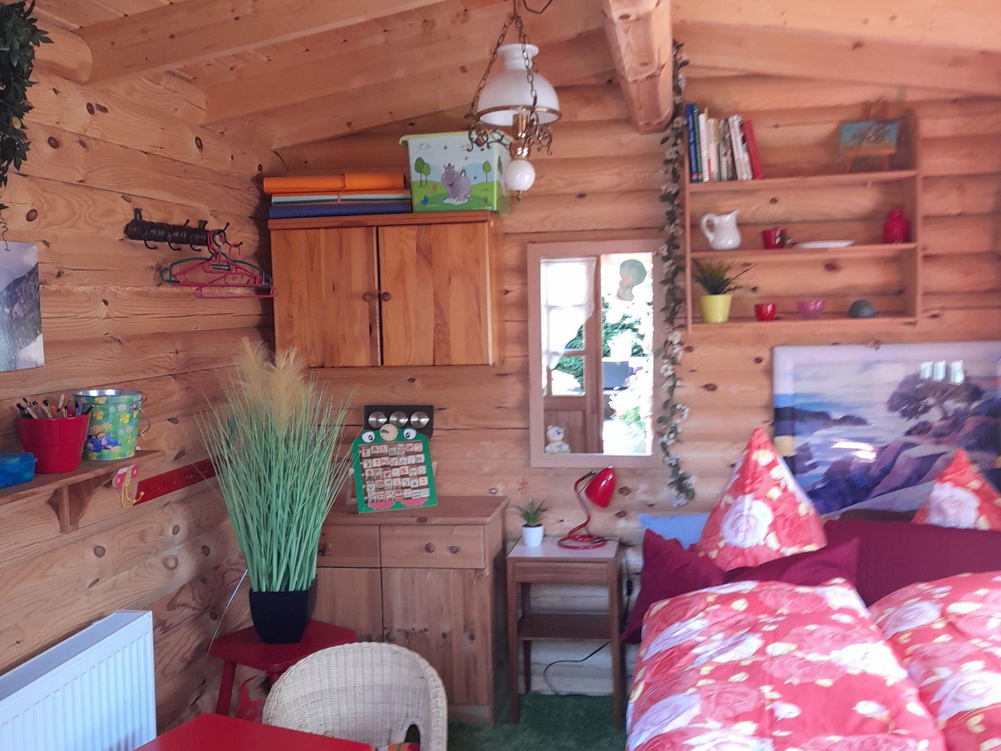 Achtung: Die Nutzung des neuen Rundbohlenblockhäuschens ist zusätzlich kostenpflichtig. Sprechen Sie die Vermieterin an.